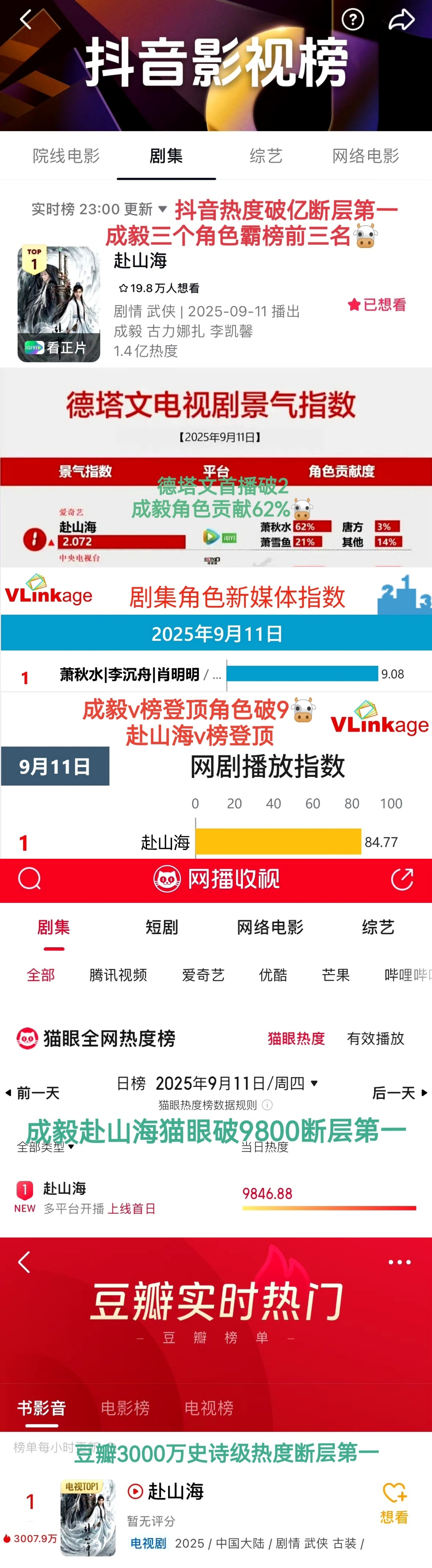 爆开!成毅赴山海首日云合登顶市占率16.8%!首日酷云登顶市占率20.99%!全