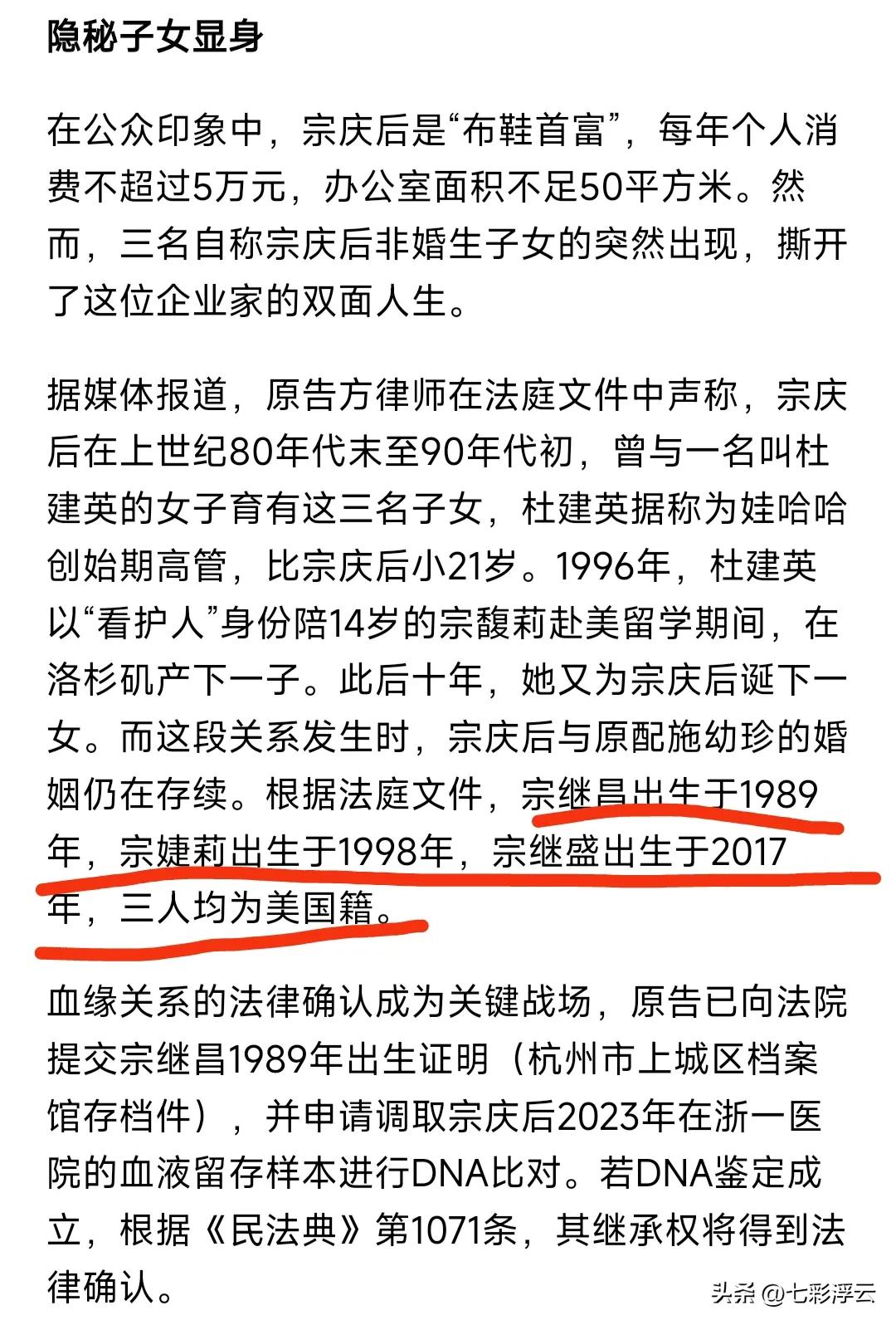 “娃哈哈”惊现豪门遗产争夺大战! 近日,一场遗产继承争夺大战震惊众人。据了解,有3名原告起诉“娃哈哈公主宗馥莉”,要求冻结其名下汇丰银行账户内18亿美元资产。 最令人吃惊的是,三名原告的身份居然是宗馥莉“同父异母弟妹”! 在我们大众的认知中,宗馥莉是娃哈哈集团创始人宗庆后唯一的女儿,这一下子冒出来三个弟弟妹妹,真的是让人瞠目结舌! 三名原告声称,宗庆后曾经承诺,每人都会获得一个信托基金,金额高达7亿美元。 大众印象中,宗庆后是一位勤俭节约,善良仁义的企业家,这突然一下子冒出来三个子女,属实让人震惊不已! 豪门的世界真的是错综复杂啊!