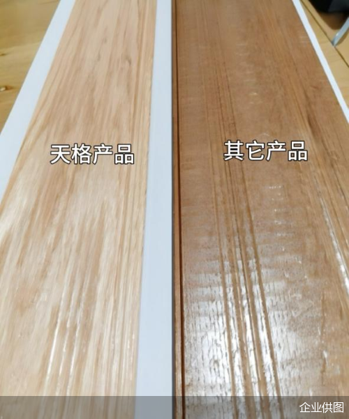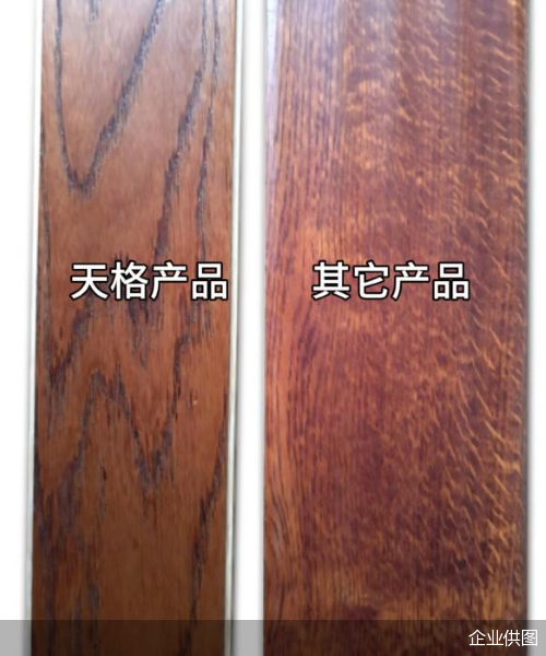 如上图所示,两款产品从正面看,都展现了原木流畅自然的纹理,古典温润细腻的手感。但翻到背面,天格产品(左)的背面是纯正、未经修饰的原木本真的纹理颜色,看起来干干净净;而对比产品(右)则是上色的,与正面颜色相同。天格产品仅在地板表面和倒角上色,地板四周、背面的五个面忠实保留了原木天然本真的颜色,两款产品的对比泾渭分明。
