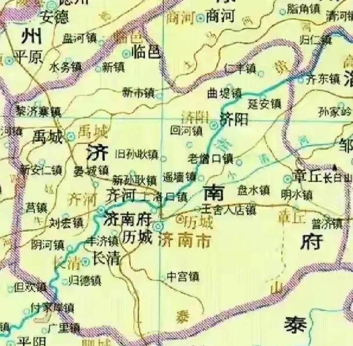 金代济南府地图 大清河从西南向东北,横穿济南府,将济南府分为河北、河南两部分,河北有四个县,即齐河、济阳、禹城、临邑,河南三个县,即历城、长清、章丘。其中历城县为济南府治所。 金代济南府隶属于山东东路,山东东路治所在益都府(即后来的青州府)。 齐河县金代设县,从地图可以看出,齐河县设县之初就属于济南府,而且历经元明清,历代都属于济南府。只是民国撤销州府后,齐河才不属于济南。 清朝后期的1855年,黄河夺大清河河道流经济南,造成济南城与黄河以北地区交通不便,因此从解放后到八十年代的几次区划调整,济南市进行扩容,先后从南边的泰安专区划入了部分县,包括历城、章丘、长清、平阴。而黄河以北的齐河等县虽然距离济南很近,但一直属于德州专区。 1982年济南第一座黄河公路大桥建成通车,之后与黄河以北的交通条件越来越好,济南逐渐具备了北跨发展的条件。1989年12月,德州地区的济阳、商河两县划归济南市。然而这次区划调整,距离济南最近的齐河县却没能划归济南,只有齐河县的桑梓店等三个乡镇划归了济南历城区。