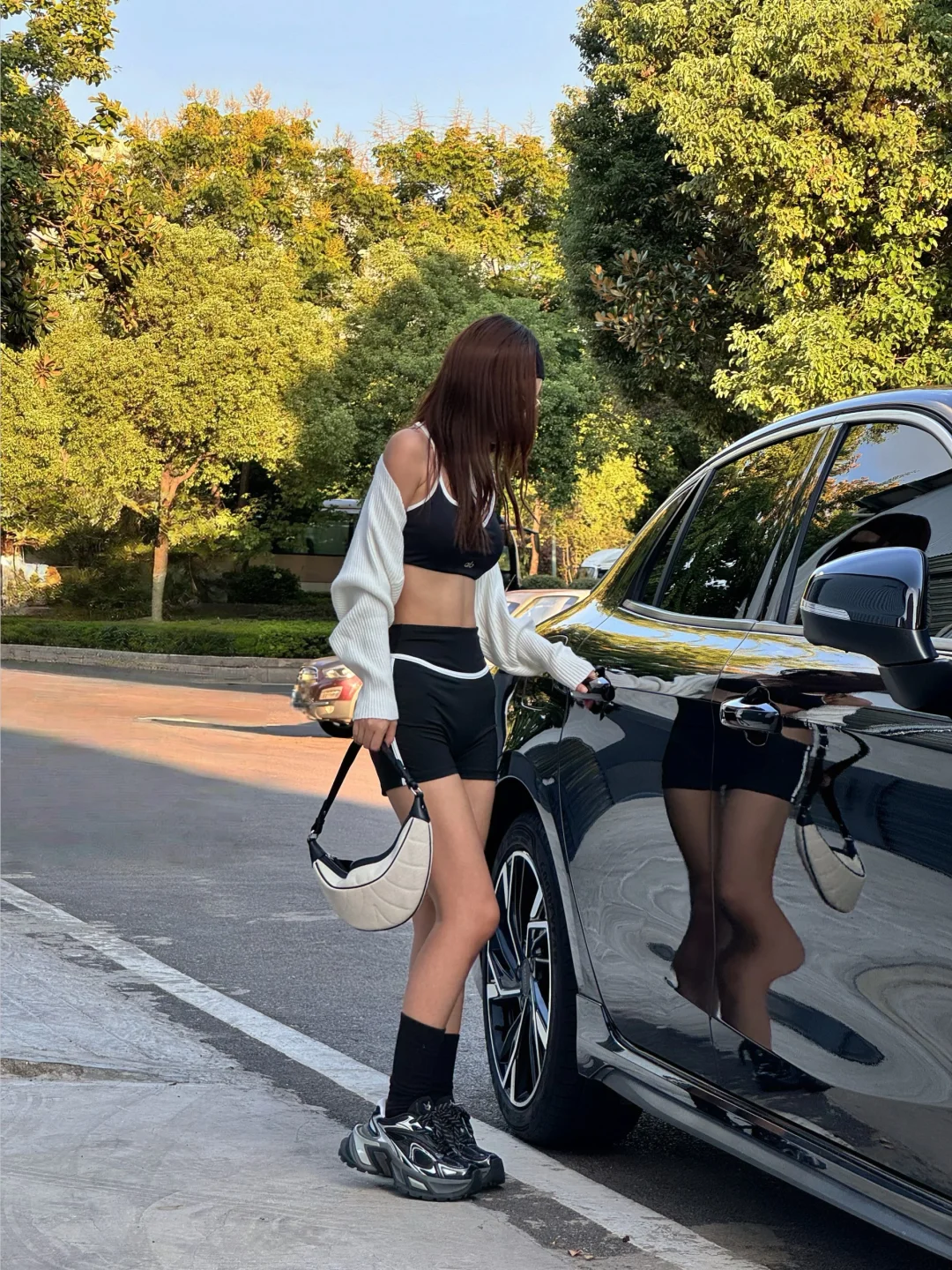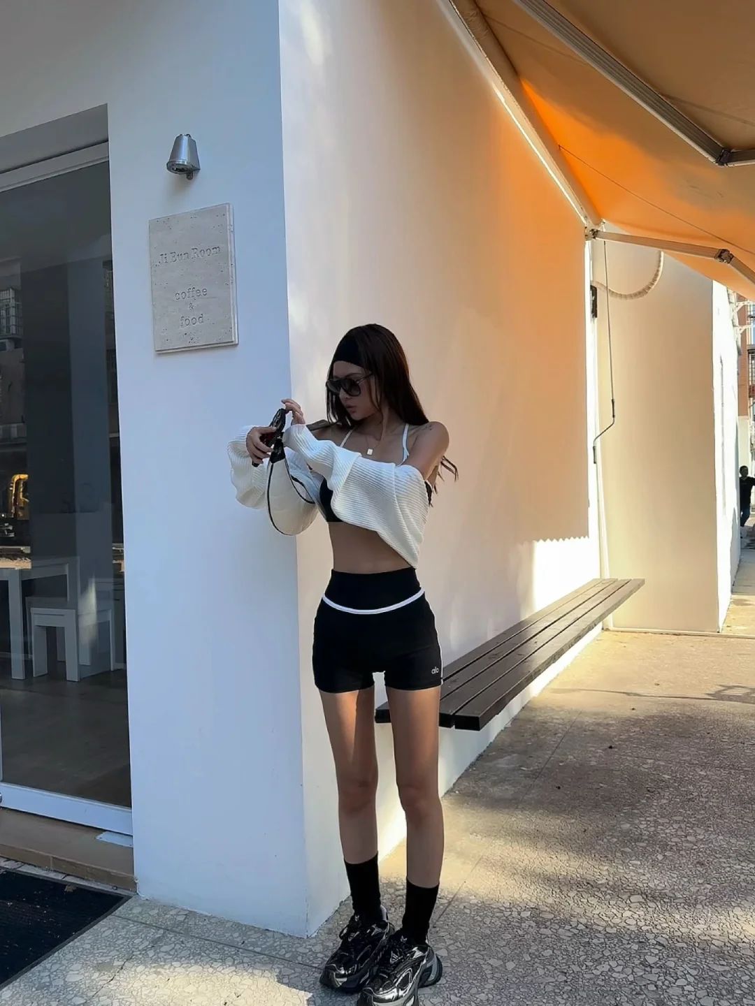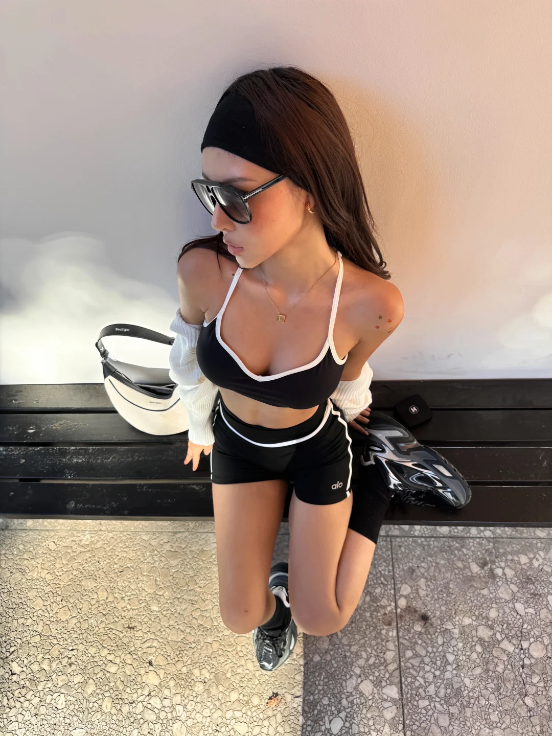 状态好的时候整个人都在发光! 收拾自己+晒太阳应该是最快的状态重启办法吧 有时候就是洗个脸、换身舒服的衣服,那种“把自己打理好”的掌控感一来,坏情绪瞬间就驱散了,什么事儿都不是事儿~ 我很喜欢海莉身上不管别人“死”活的稳定感 今天的inspo就来自她~ 她的街拍穿搭都很白女 简约精致的城市运动感 很hot 但不会太过 所以我穿了套简单的瑜伽服 搭配了一双OGR 水狼蛛 厚底的设计可以拉长小腿 鞋子流动的科技线条感又消融了整体look的运动感 会更时尚摩登一点✨