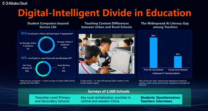 “我们发现,未来的教育鸿沟不再仅仅是传统意义上的城乡差异,而是体现在对AI技术的理解和应用能力上。”阿里云教育高级副总裁、少年云项目负责人黄桂晶在演讲中表示。在她身后的大屏幕上,呈现的不是繁华都市的科技图景,而是中国乡村教室里的孩子们正在通过AI云教室与远方教师互动、通过智能平台记录本土民俗文化的真实场景。