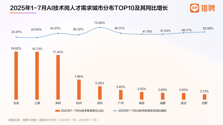 在招聘中明确提出要求掌握AI工具的职位数量正呈现爆发式增长。猎聘大数据显示,今年1月-7月,同比增长率达152.27%。