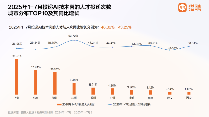 杭州依托数字经济先发优势和头部企业集聚效应,展现出强劲的人才吸引力。从投递TOP10城市的人次同比增长来看,今年1月-7月投递杭州AI技术岗的人次增长率超93%。