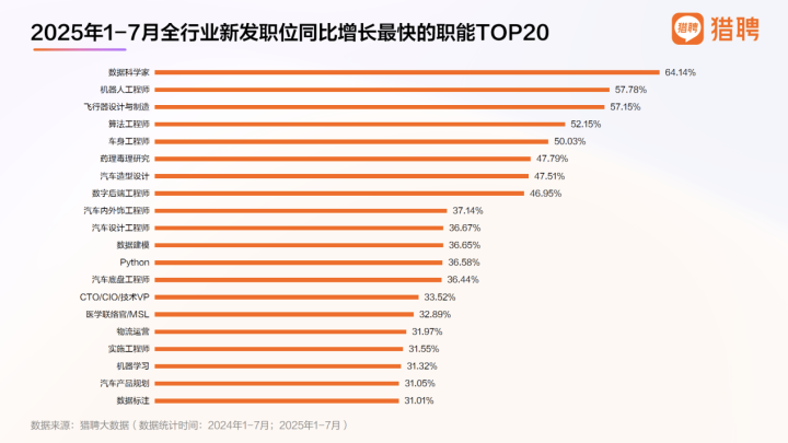 今年1月-7月同比增长最快的TOP20职能中,数据科学家以64.14%的同比增速高居榜首,算法工程师(52.15%)、数据建模(36.65%)和机器学习(31.32%)等典型AI岗位均进入TOP20。