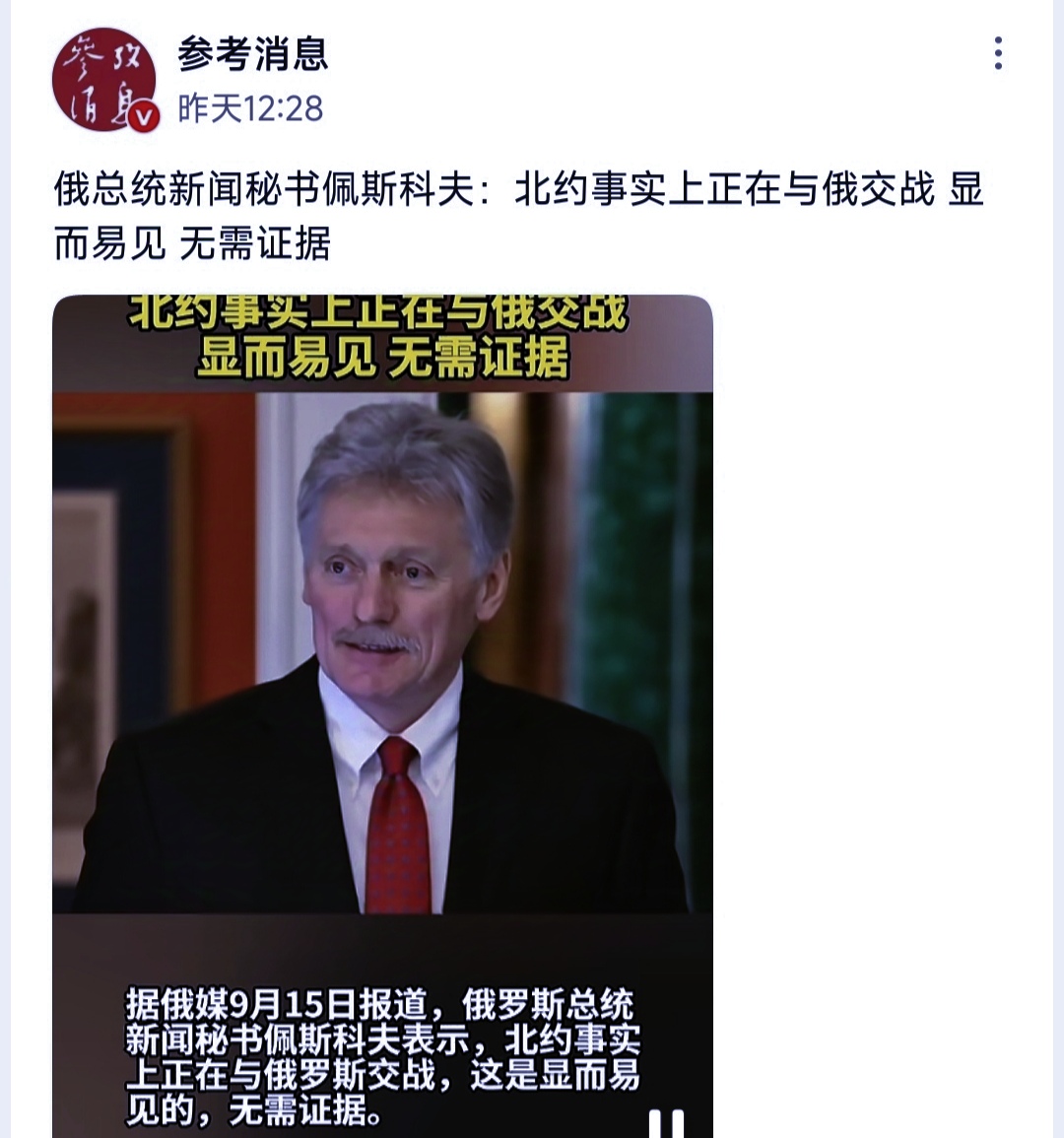 援引参考消息的报道,俄总统新闻秘书佩斯科夫说“北约事实上正在与俄军交战,显而易见,无需证据”,实际上佩斯科夫这里说的是北约早已经打着雇佣兵的幌子派正规军进入乌克兰与俄军作战,其实这早已人尽皆知,反正都打起来了,这一层窗户捅不捅破已经没意义。现在看来,俄乌和平谈判已经彻底没希望了,就看看北约和俄罗斯,谁会第一个选择妥协。