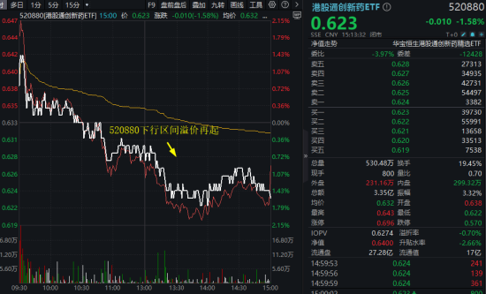值得关注的是,港股通创新药ETF(520880)盘中翻绿走低区间,场内再起溢价,且跌幅愈深,溢价愈高,反映或有资金逢跌吸筹。