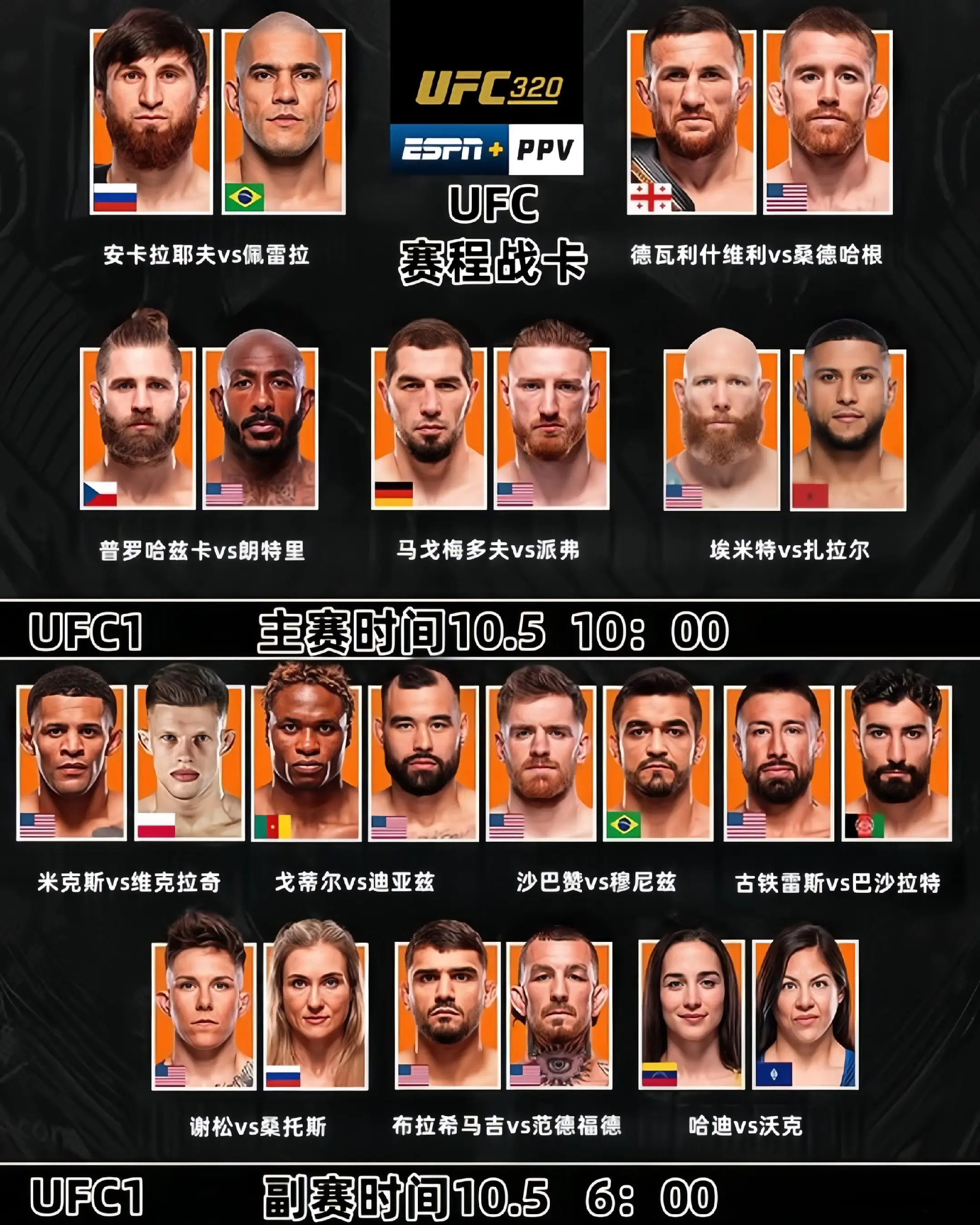 UFC320赛程战卡🔥🔥🔥🔥🔥。安卡拉耶夫vs佩雷拉