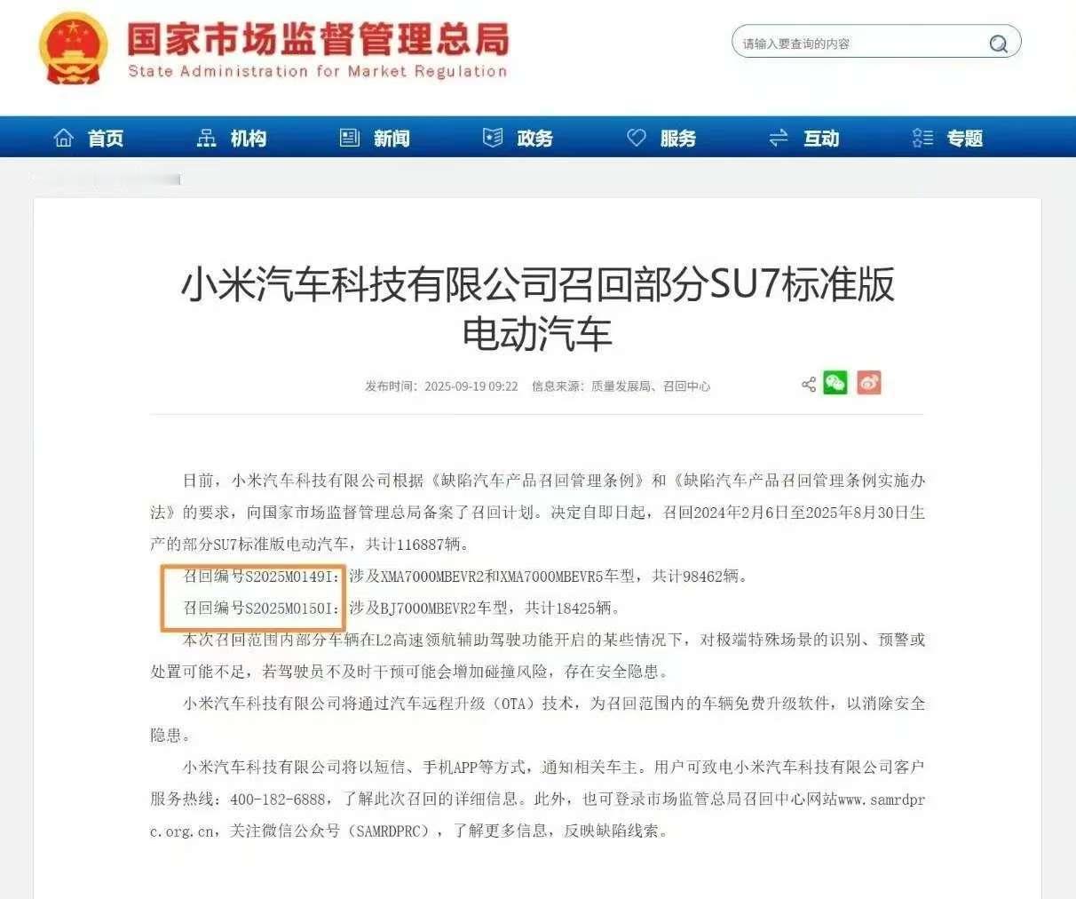 小米SU7召回11.7万辆=出大事?别被带节奏!这3个真相得说清 刚刷到“小米召回11.7万辆SU7”的消息时,不少人心里一紧:难道小米汽车真出质量问题了?再看热搜榜,“雷总”“小米汽车安全隐患”的词条已经飘起来,底下甚至有不少恶意揣测的声音,仿佛小米一下就“翻车”了。但别急着跟风焦虑,这事得掰开揉碎了说——所谓“召回”,根本不是你想的那样。 首先得明确一个关键前提:这次小米是“主动备案OTA召回计划”,和大家印象里“出了事故才召回”完全不是一回事。官方公告里写得明明白白,目前没有任何已发生的事故案例,这次召回本质是通过OTA远程升级消除潜在安全隐患——相当于给车做一次“预防性体检”,而非“治病抢修”。智能汽车本就是靠软件迭代优化体验的产物,OTA召回更像是“在线打补丁”,反而说明车企在主动把控风险,这怎么就成了“出大事”? 再看看行业常态,就知道小米这事有多“普通”。拿大家熟悉的特斯拉来说,光2024年就有7次召回记录,2025年至今累计召回量已突破120万辆;再看保时捷、宝马、奔驰这些豪华品牌,每年召回量常以“百万辆”为单位,怎么没人说它们“天天出问题”? 说到底,还是小米的热度太高,一点动作就被放大。要知道,目前所有车企的智能驾驶都还停留在L2级,技术迭代中出现需要优化的地方很正常,国家出手加强管控、车企主动配合备案,这是行业走向规范的表现,而非“黑料”。 更该关注的是,这次召回背后还藏着一个好消息:小米汽车即将推送OTA秋季版本升级。据透露,升级后SU7的语音响应速度会提升30%,车机与手机的跨设备协同更流畅,甚至有用户实测,部分功能体验直接对标行业标杆YU7——相当于花一样的钱,让车的“ brains ”再升级一次,这难道不是好事? 最后必须提一句那些恶意泼脏水的行为。央视早就点名批评过这类“为黑而黑”的黑公关,国家也出台了明确规定打击恶意抹黑。前不久小米还联合小鹏、蔚来等车企共同发声,抵制行业乱象——说到底,拿“召回”做文章误导消费者,既不专业也不道德。 智能汽车还在成长阶段,“主动召回”从来不是“雷池”,而是车企负责任的体现。与其盯着“11.7万辆”的数字焦虑,不如多看看升级后实实在在的体验提升。理性看待行业动态,才是对自己钱包和行车安全最负责的选择。
