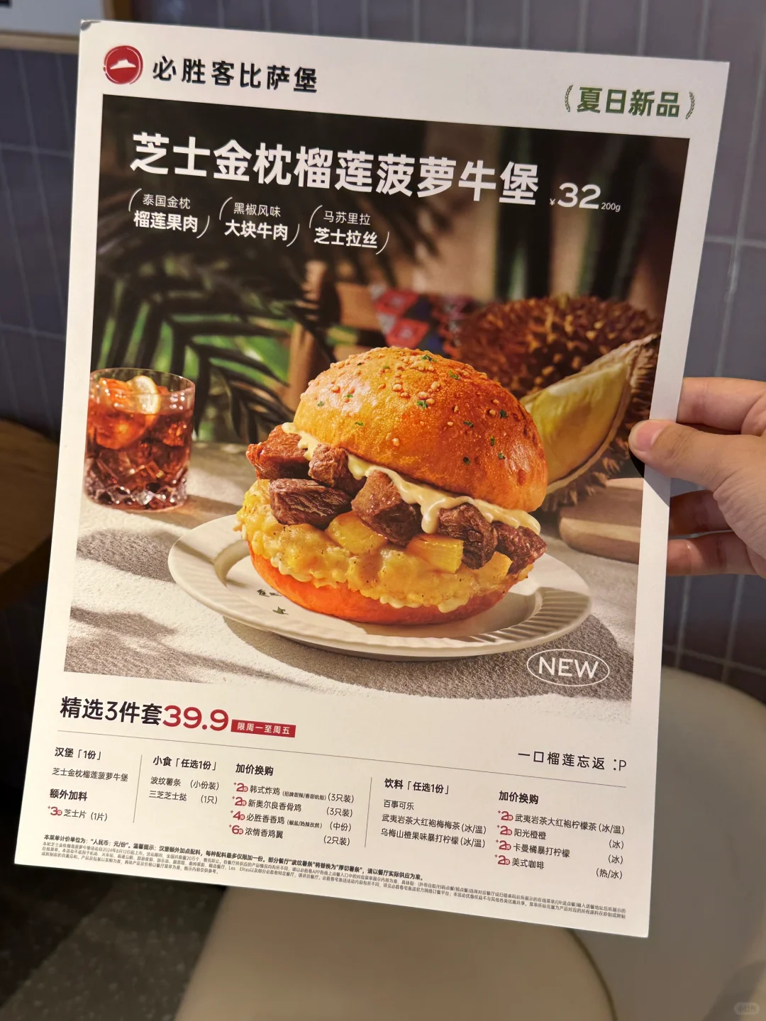 必胜客汉堡又又又上新了,真的创作没有瓶颈啊,真的是我第一个吃到的真实榴莲果肉的汉堡了!第一时间赶来测评一波,榴莲脑袋爱了!