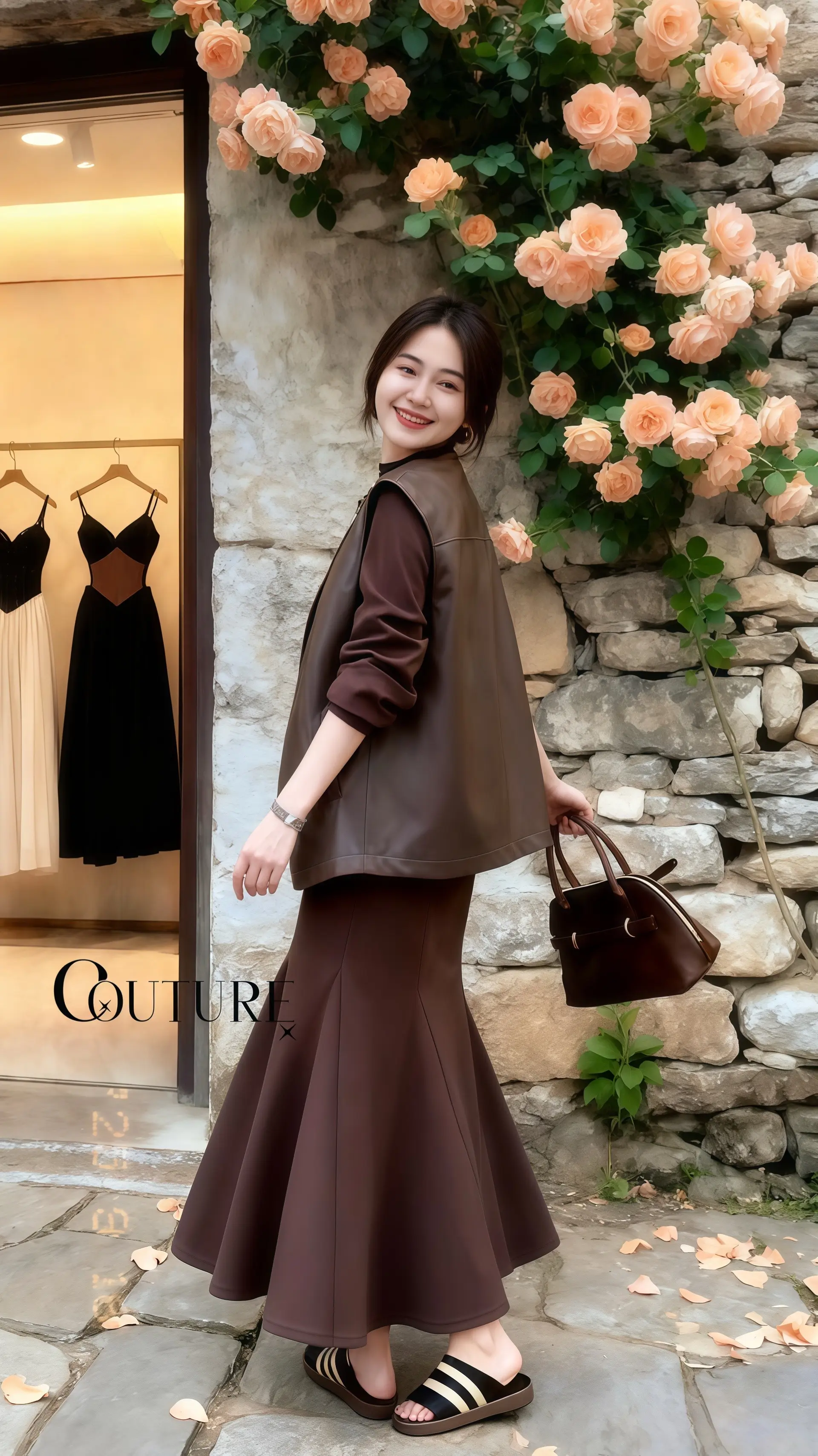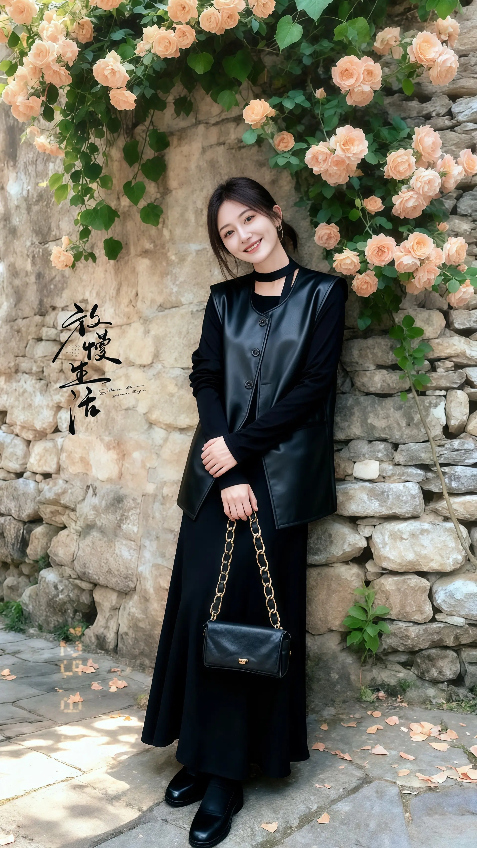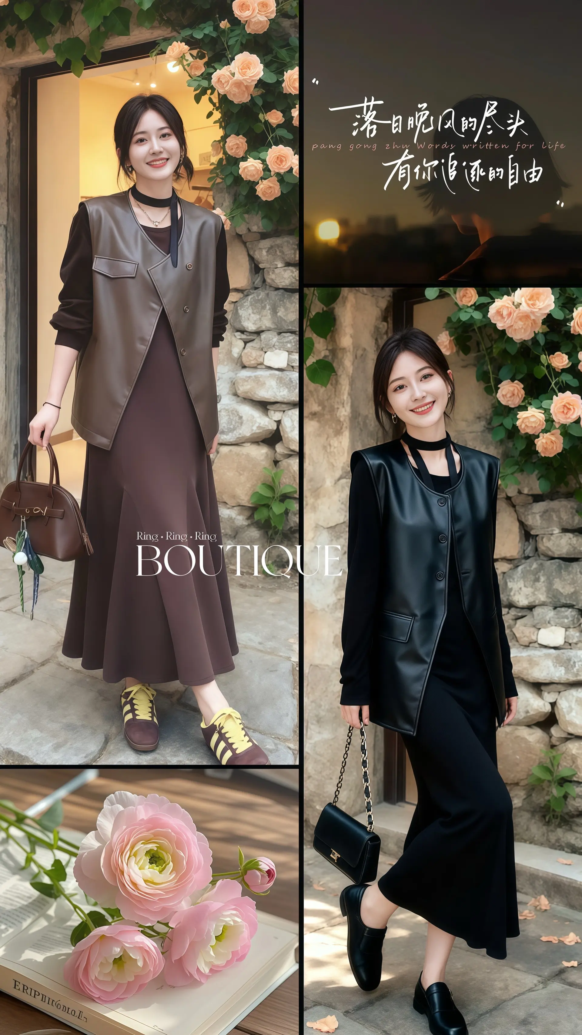 晓薇穿着气质两件套站在复古石头墙女装店门前,大码无袖皮马甲利落剪裁勾勒出松弛廓形,金属按扣泛着细腻光泽,叠穿的长袖连衣裙垂坠感十足,裙摆随微风轻晃时藏着慵懒韵味。斑驳的石头墙爬着几缕浅绿藤蔓,与她身上的两件套形成温柔碰撞。抬手整理马甲领口时,指尖不经意触到裙摆褶皱,笑意漫上眉梢,复古与现代的融合在她身上自然流淌,每一处细节都透着不费力的精致,仿佛把秋日里的优雅全都穿在了身上。