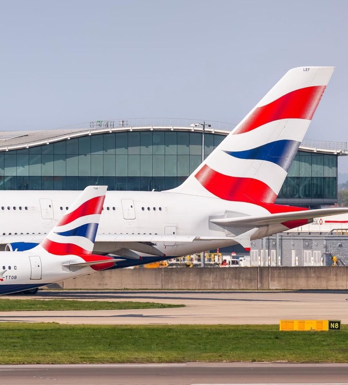 一大和一小 英国航空的A380和A320正缓缓滑向希思罗机场的09R跑道,准备飞往地球的两端