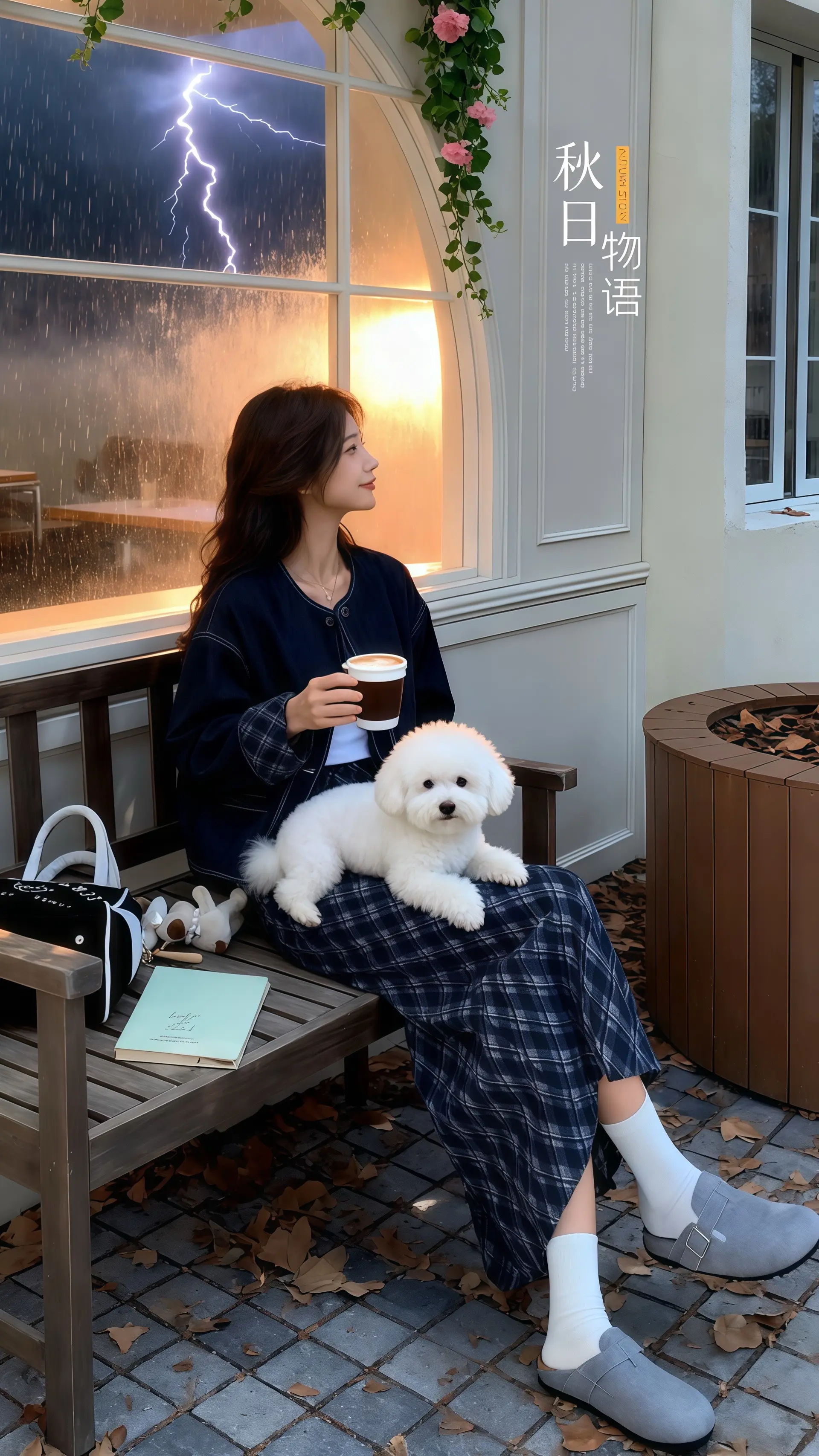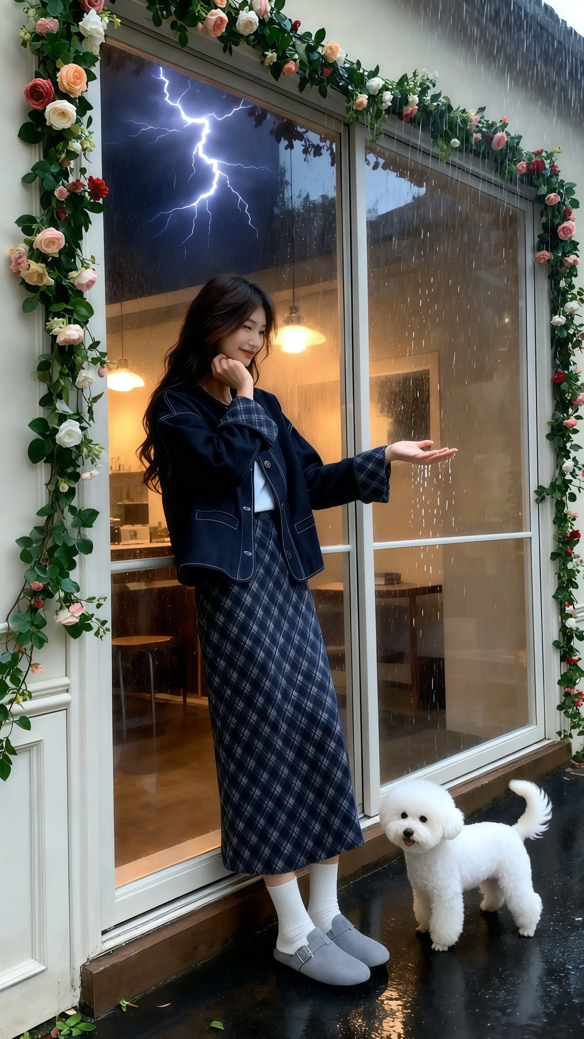 她穿着复古牛仔格纹两件套,水洗牛仔外套漫着旧时光的软,格纹半身裙裙摆随步轻晃,藏着恰到好处的复古腔调。咖啡店暖黄的灯透过玻璃漫出来,她立在门前檐下,指尖捏着半杯热拿铁,氤氲热气模糊了细雨的轮廓。雨丝细如针,织着朦胧的雾,远处天空忽有银亮闪电劈开云层,紧接着闷雷滚过,倒让这静谧多了几分张力。她抬头望了眼雨幕,发梢沾了星点雨珠,却笑得从容。牛仔的率性撞上古裙的温婉,在雷鸣雨落间,自成一幅有故事的画。
