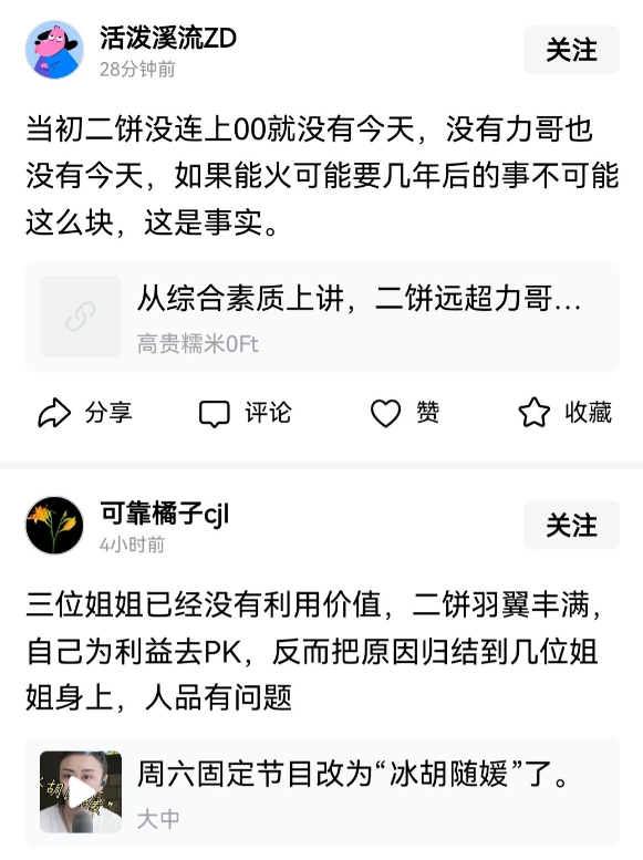 新名词“冰胡随缘”在网络上蔓延,今天对二饼老师的声讨可谓是铺天盖地[捂脸]看到昨晚会员群老师搞的活动,我一点都不为二饼力哥担心!得道者多助!为维护力饼媛这个品牌,二饼多次选择站位老同学而忽视众多粉丝的感受,到现在这局面,我只想说,一切来的太晚了,但是better late than never!感谢老同学,在你的呵护下,二饼力哥有能力单飞了,也希望老同学再现伯乐本色,带出下一位“二饼”![比心]