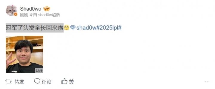 原来是连续剧!Shad0w赛后更博:冠军了头发全长回来啦