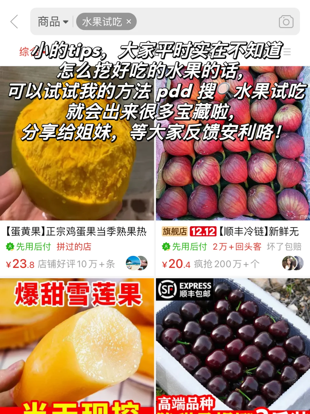 这次厉害了,选了6款广东党很少见的水果买回来,居然都好吃!平价实惠,还不怕坏,一坏就赔! 小的tips,大家平时实在不知道怎么挖好吃的水果的话,可以试试我的方法 pdd 搜🔍水果试吃 就会出来很多宝藏啦,分享给姐妹,等大家反馈安利咯!