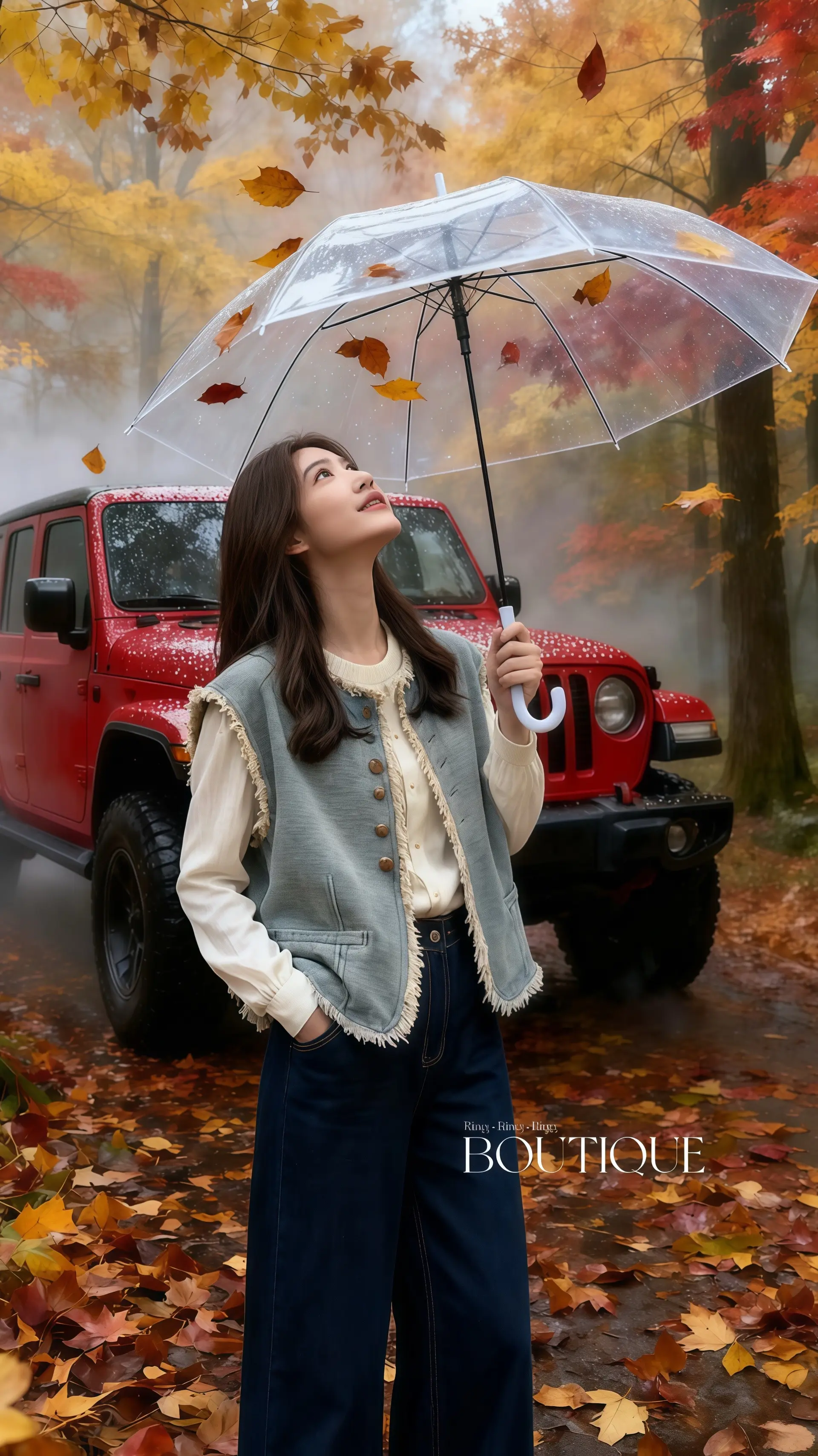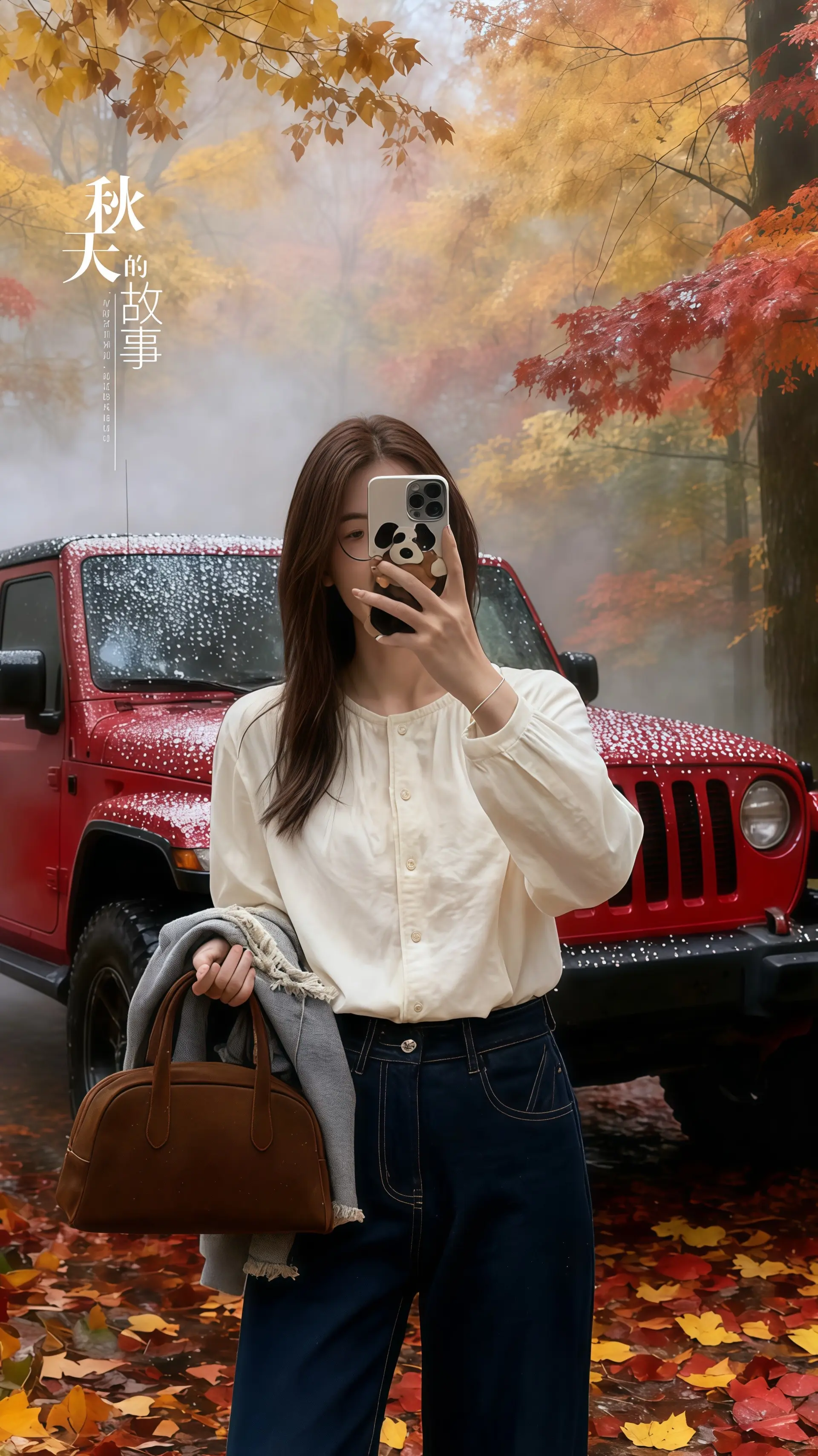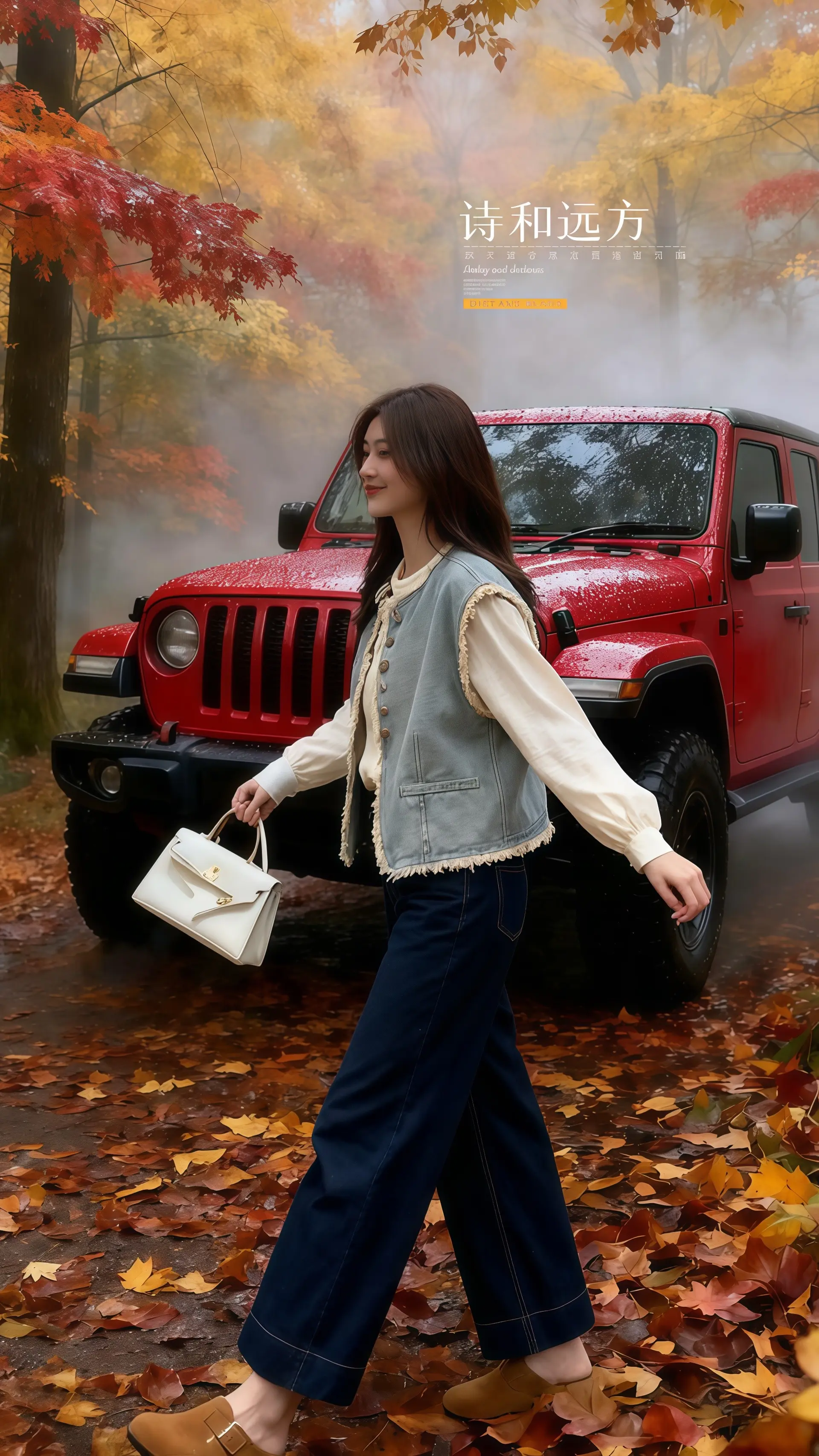 她穿着韩系马甲三件套,踩双小白鞋,每一步都踩在秋日的浪漫里。漫步进枫叶树林,红枫簌簌落在肩头,抬手拂开的瞬间,满是惬意松弛。不远处停着辆红色越野车,金属车身映着漫天枫红,成了最好的背景板。她偶尔靠在车边整理马甲领口,偶尔拾起一片枫叶把玩,阳光透过枝叶洒在身上,把韩系穿搭的慵懒与秋日树林的诗意,揉成了一幅让人想定格的画面。
