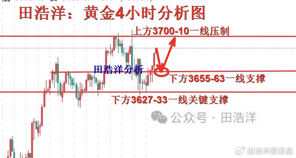 从4小时分析来看,下方的有效支撑则维持于3655-64附近区域,上方的重点压力则维持于3700-3710区间一线,操作上以回踩做多为主,中间位置一律多看少动谨慎追单,耐心等待关键点位进场。具体操作策略我会在盘中提示,及时关注。