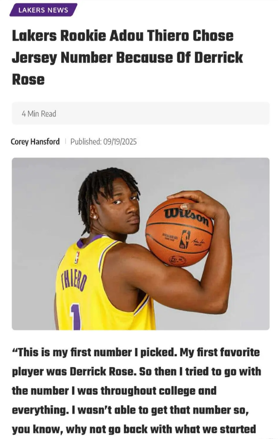湖人新秀阿杜·蒂耶罗爆料,自己之所以选择1号球衣是因为崇拜德里克·罗斯!