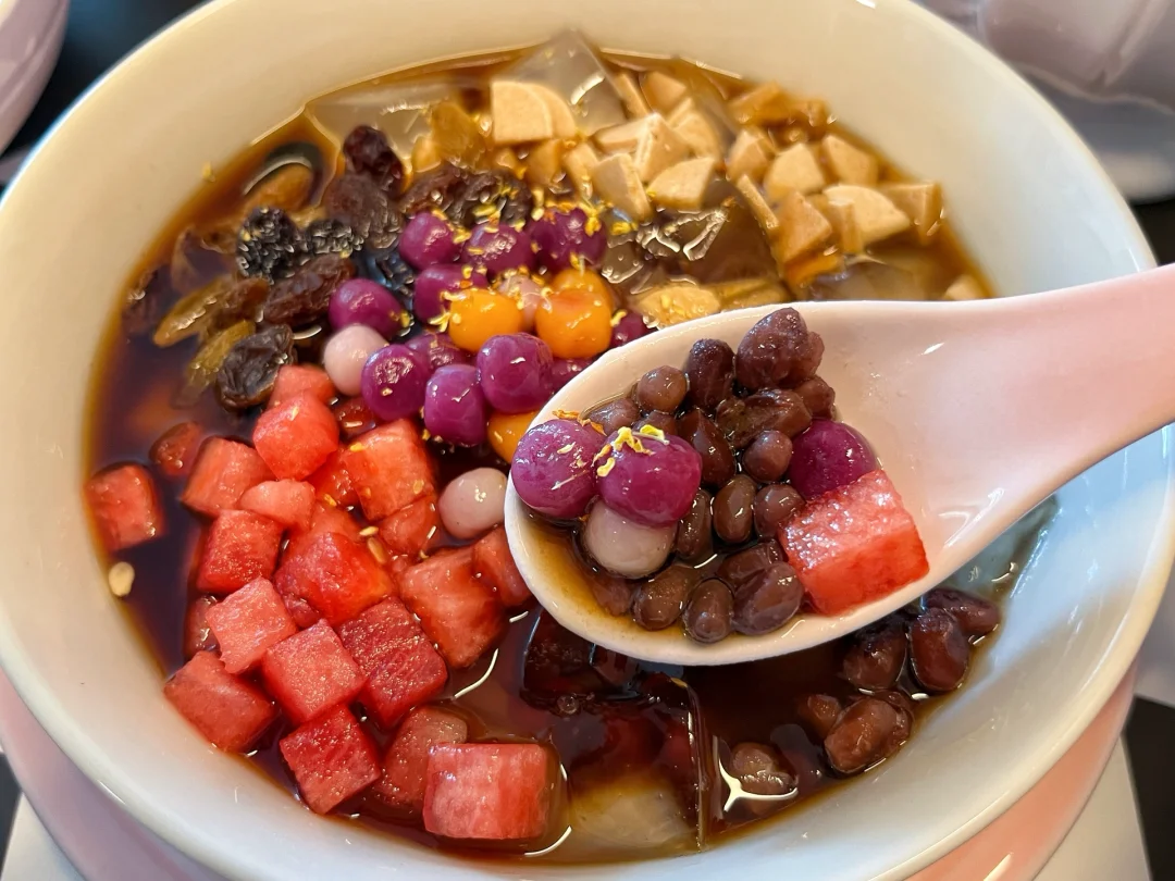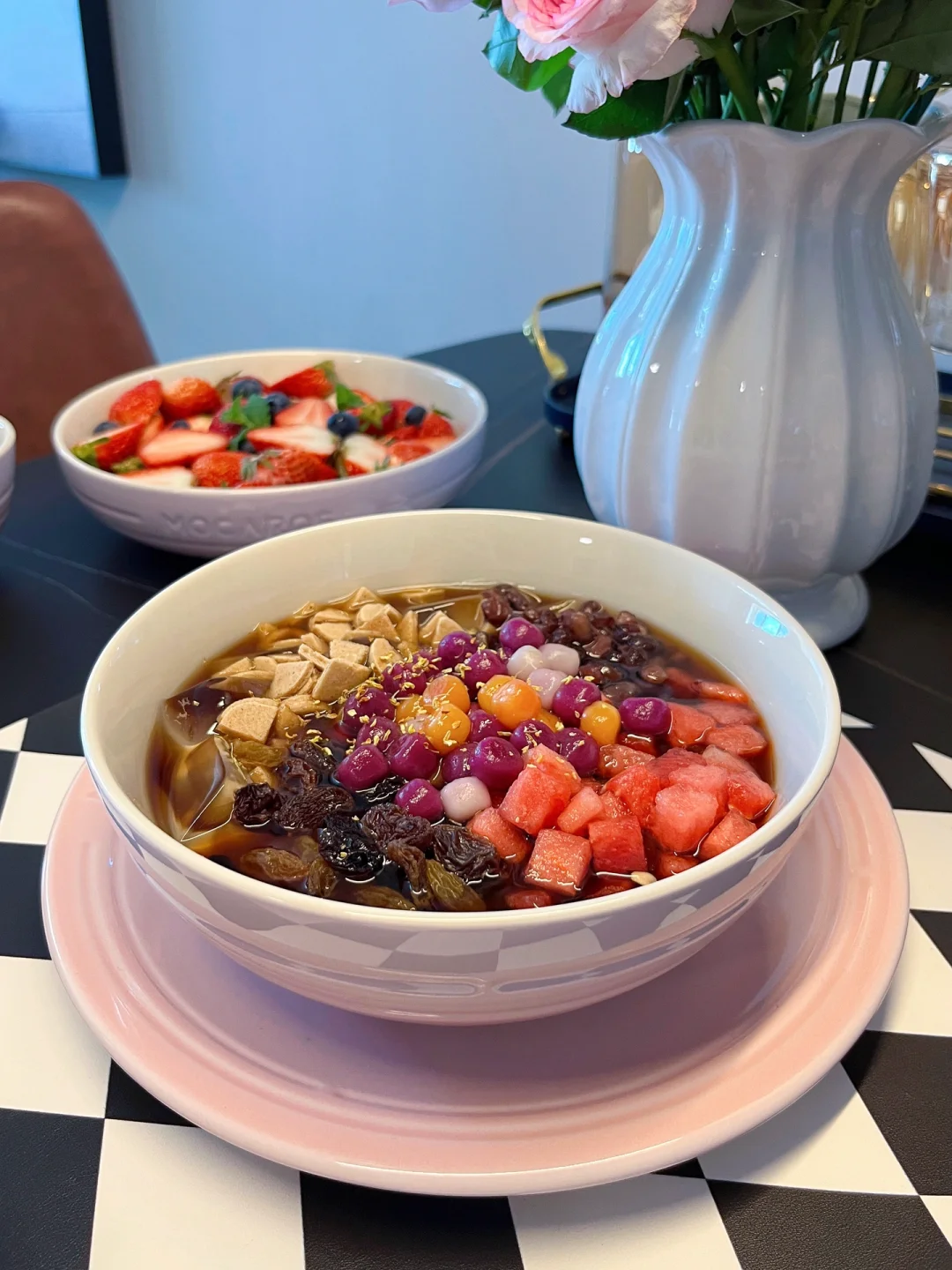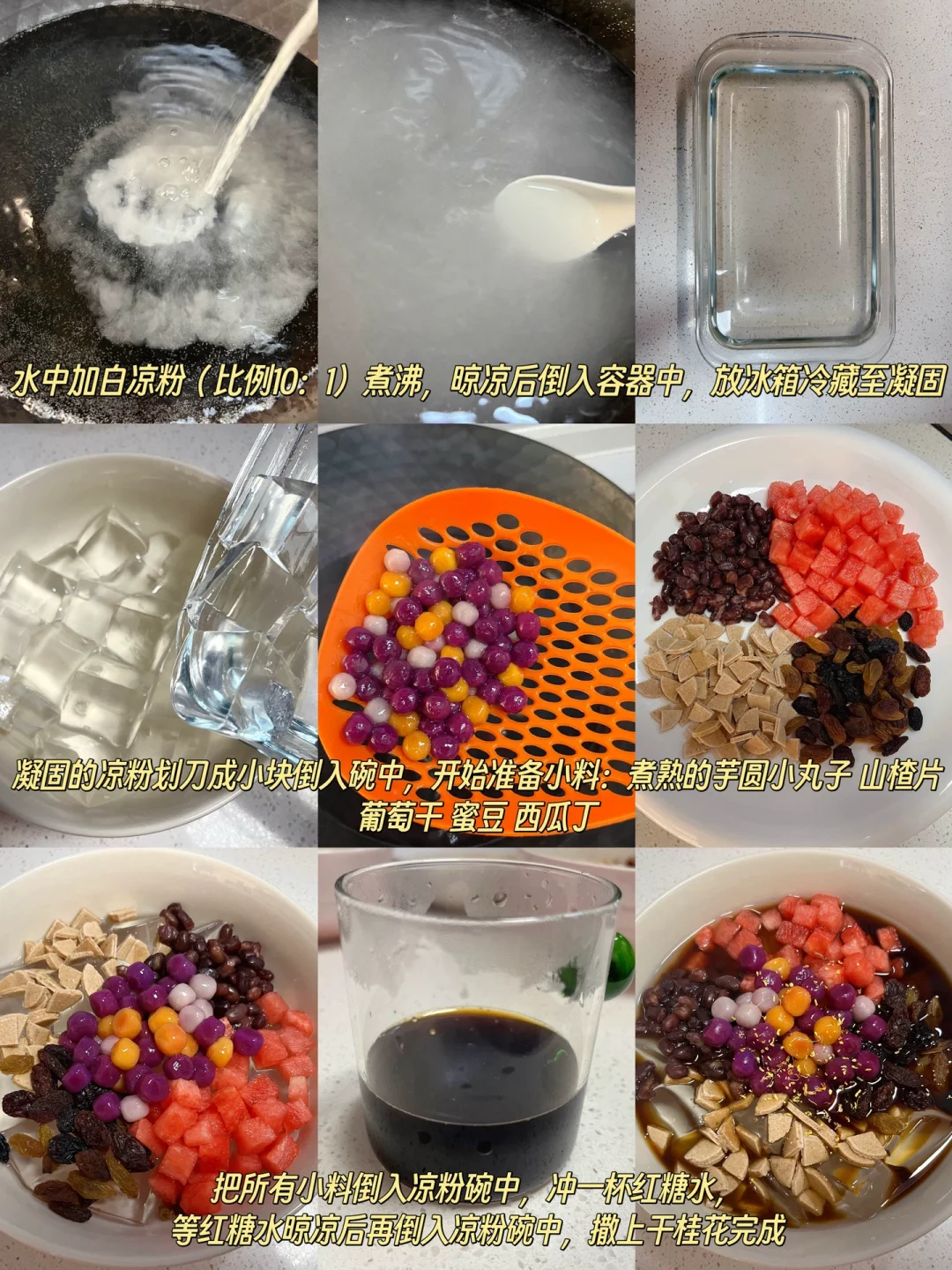我宣布夏日餐桌上的消暑小甜品就属它啦! 冰凉凉的冰粉上面淋上红糖,加上糯叽叽的芋圆、西瓜丁、山楂干、葡萄干 太好吃了! 学会了就再也不用去外面排队买了~自己做的主打一个料足想加什么、加多少自己说了算~ 教程图奉上,喜欢的姐妹一起做起来呀~
