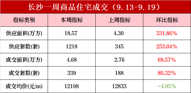 新房市场方面,上周(9.13-9.19)长沙内五区(含高新区、长沙县托管区域)一手住宅成交339套、4.68万方,成交均价12198元/㎡。供应上,一手住宅供应1218套、18.57万方。