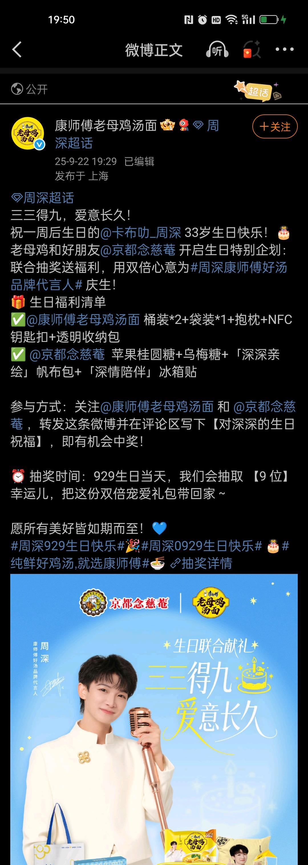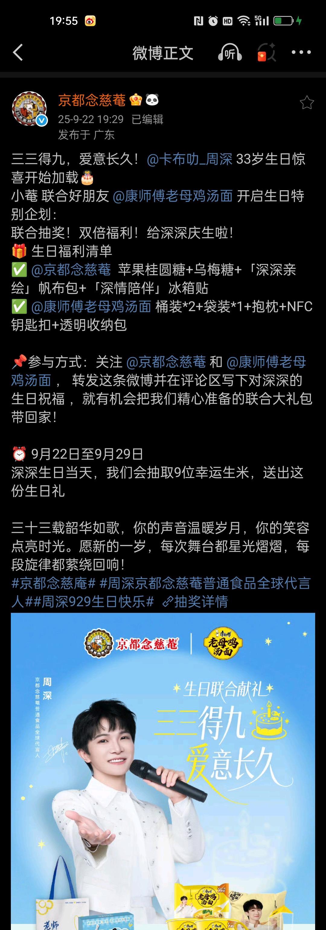 周深所代言的康师傅老母鸡汤面与京都念慈菴,两家国民品牌为周深联名庆生送礼! 已转