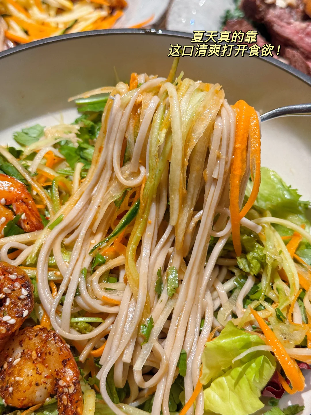 沙拉党直接冲这款!底下超多新鲜蔬菜,开背虾Q弹,青木瓜丝清爽,配着荞麦面超解腻。泰式辣青柠汁一淋,酸甜辣全有,夏天吃超舒服又满足~