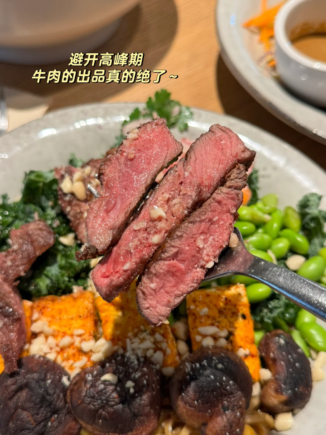 健身党冲这个!牛菲力嫩到爆汁,淋上特调的沙爹酱巨香,用来拌荞麦面绝了。还有萝卜丝、豆腐等蔬菜,真是双重蛋白叠加,营养均衡还轻负担,份量超足的,男生也可以吃的很满足!