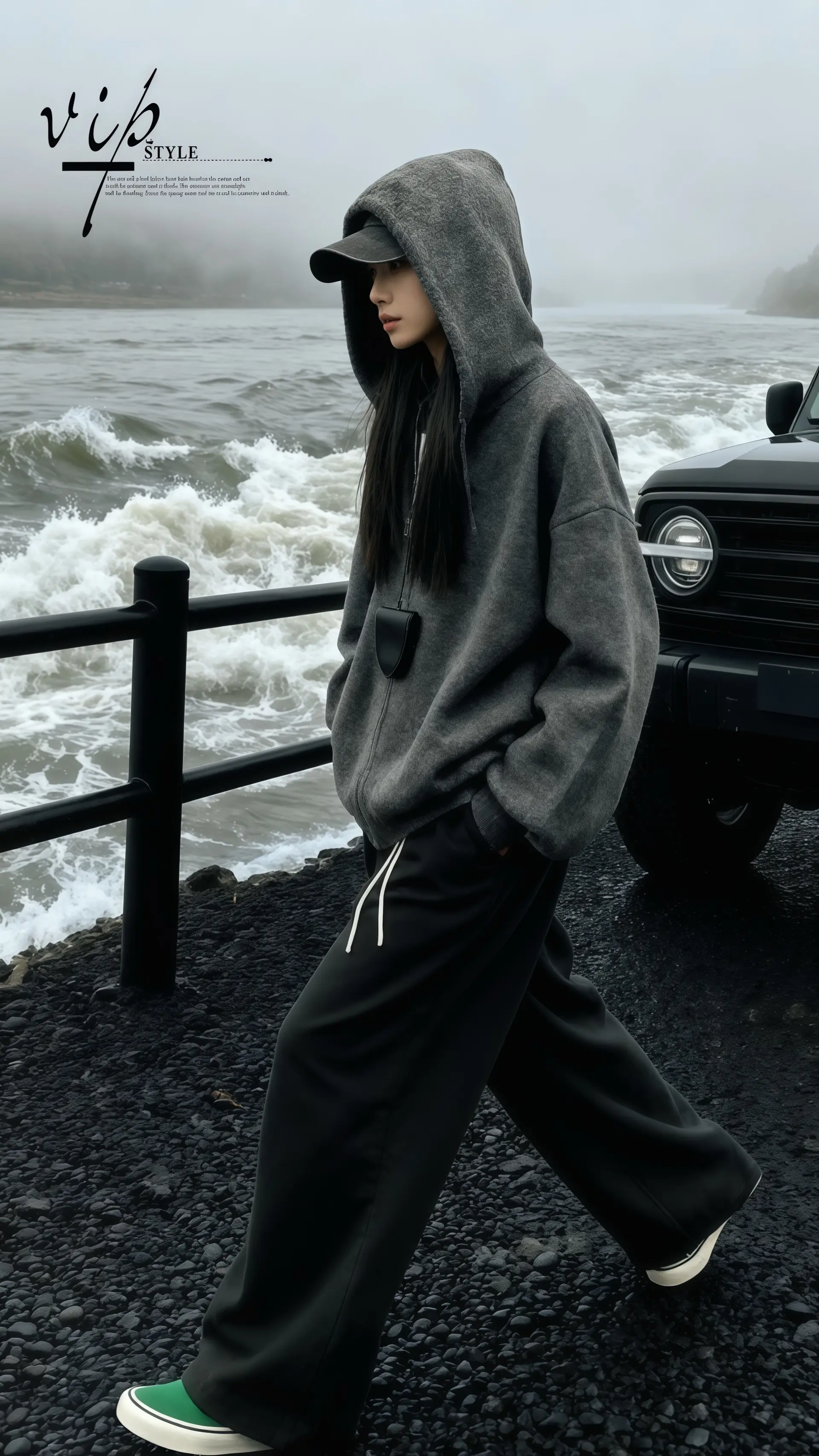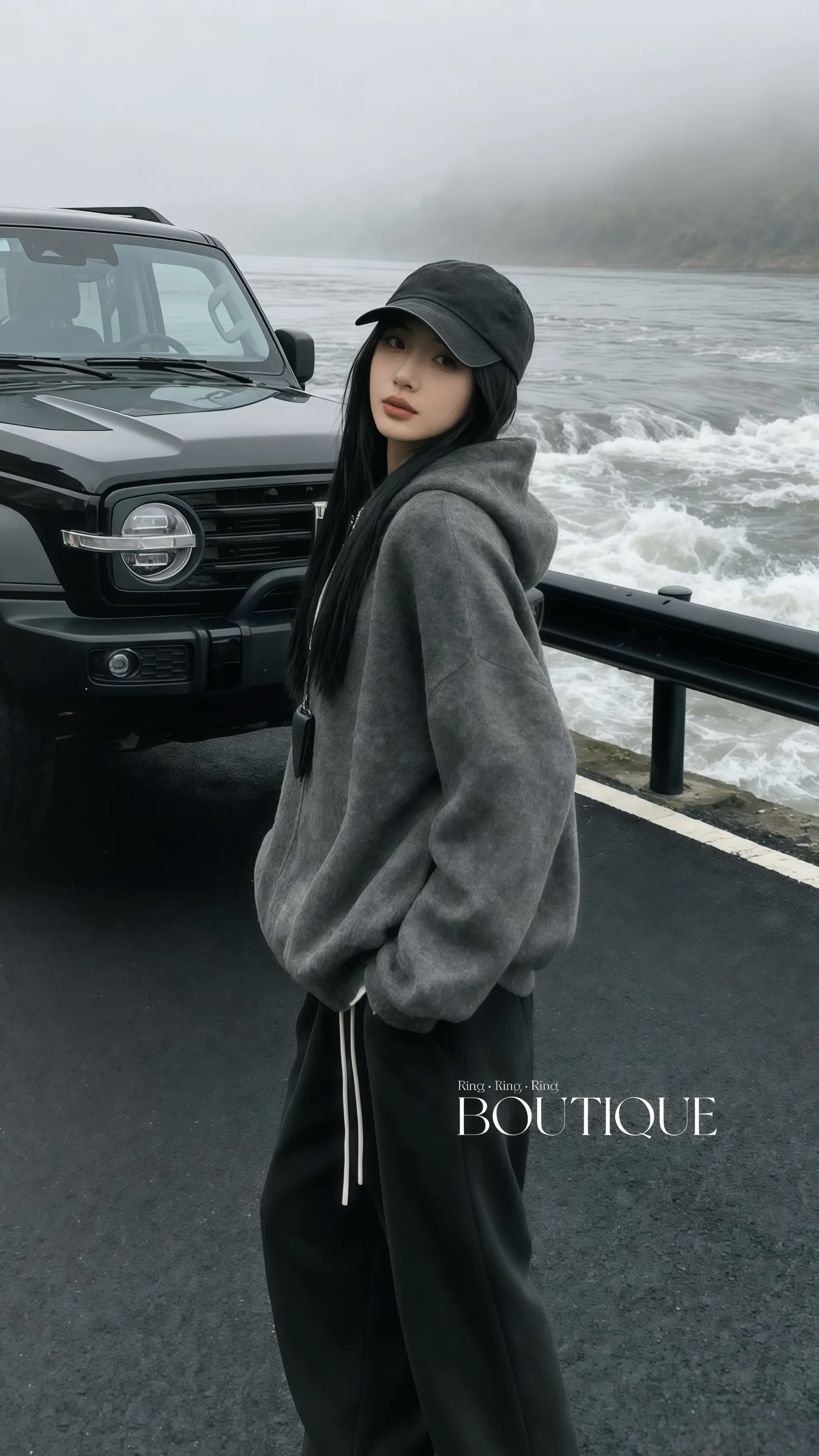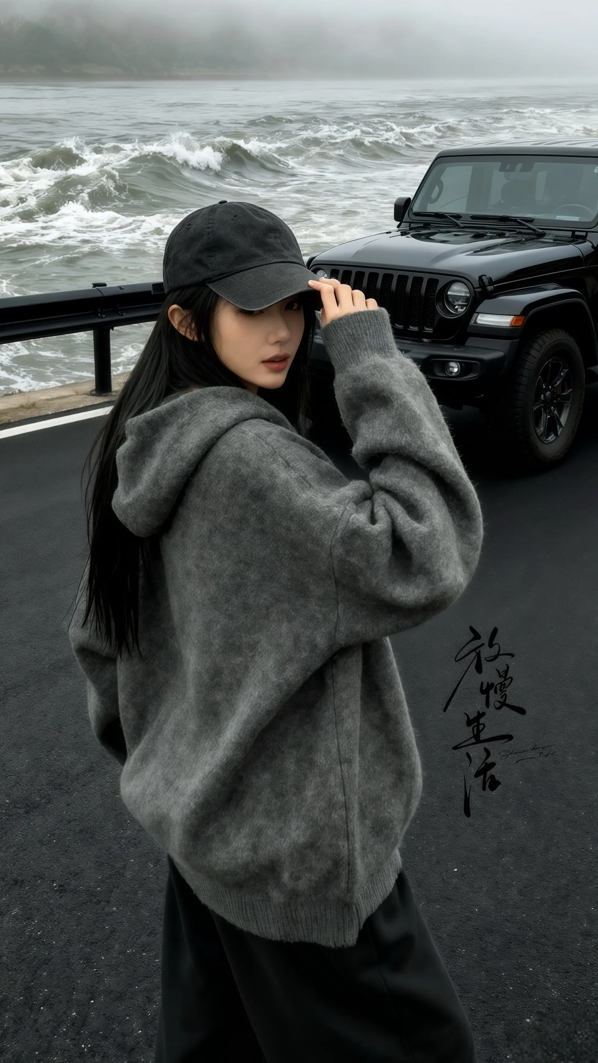 在雾气氤氲的江畔,她以一件韩系慵懒风连帽毛衣外套为盾,将松弛感穿在身上。灰调织物随江风轻晃,连帽下的轮廓藏着随性的诗意。身后黑色越野车如沉默的骑士,与波涛汹涌的江水形成张力,浪涛拍碎在岸,也拍醒了都市人的倦怠。她立于黑白灰的电影感画面里,把日常的庸碌抛在风里,任毛衣的软糯与江风的凛冽碰撞,在这片雾锁的江景中,活出了独一份的韩系慵懒与自由。