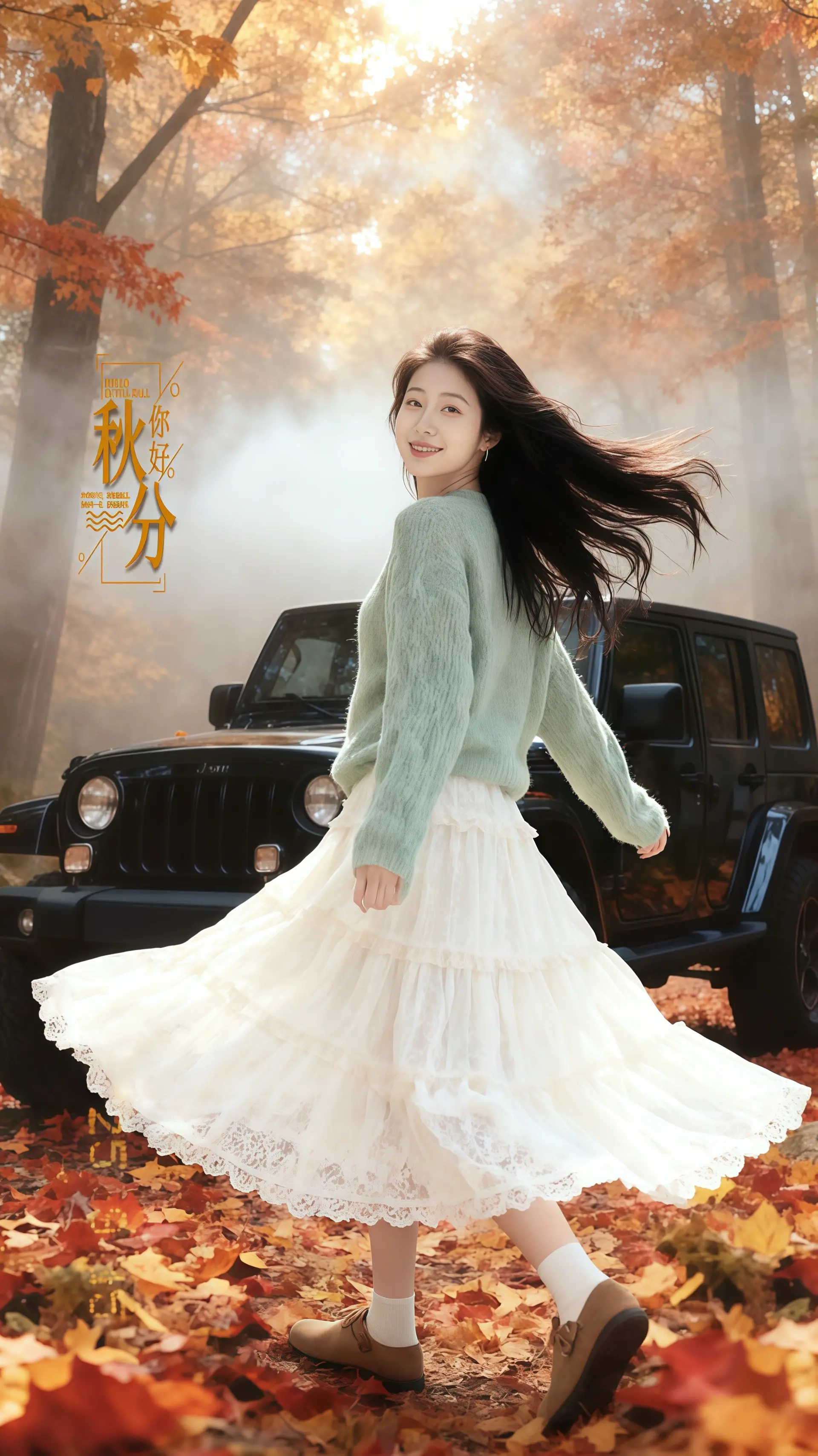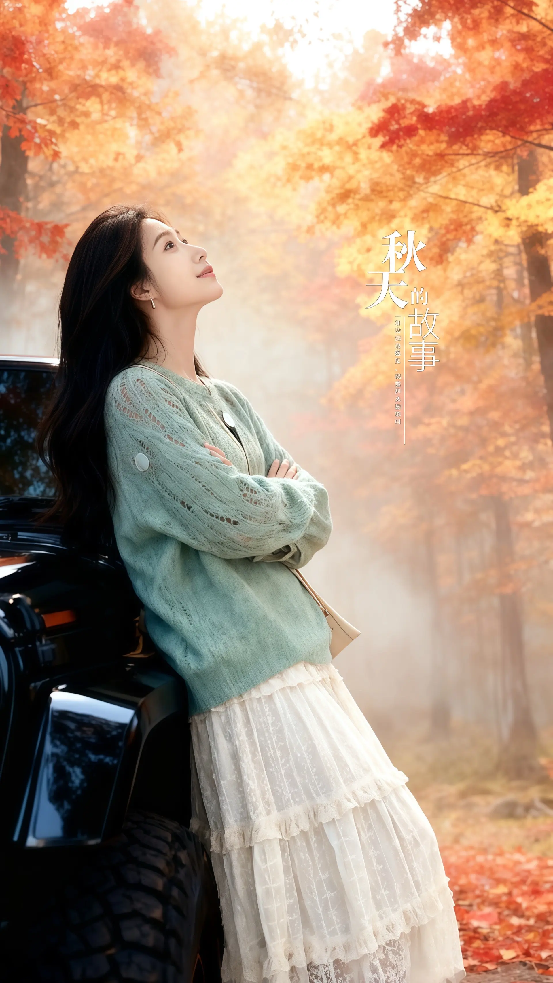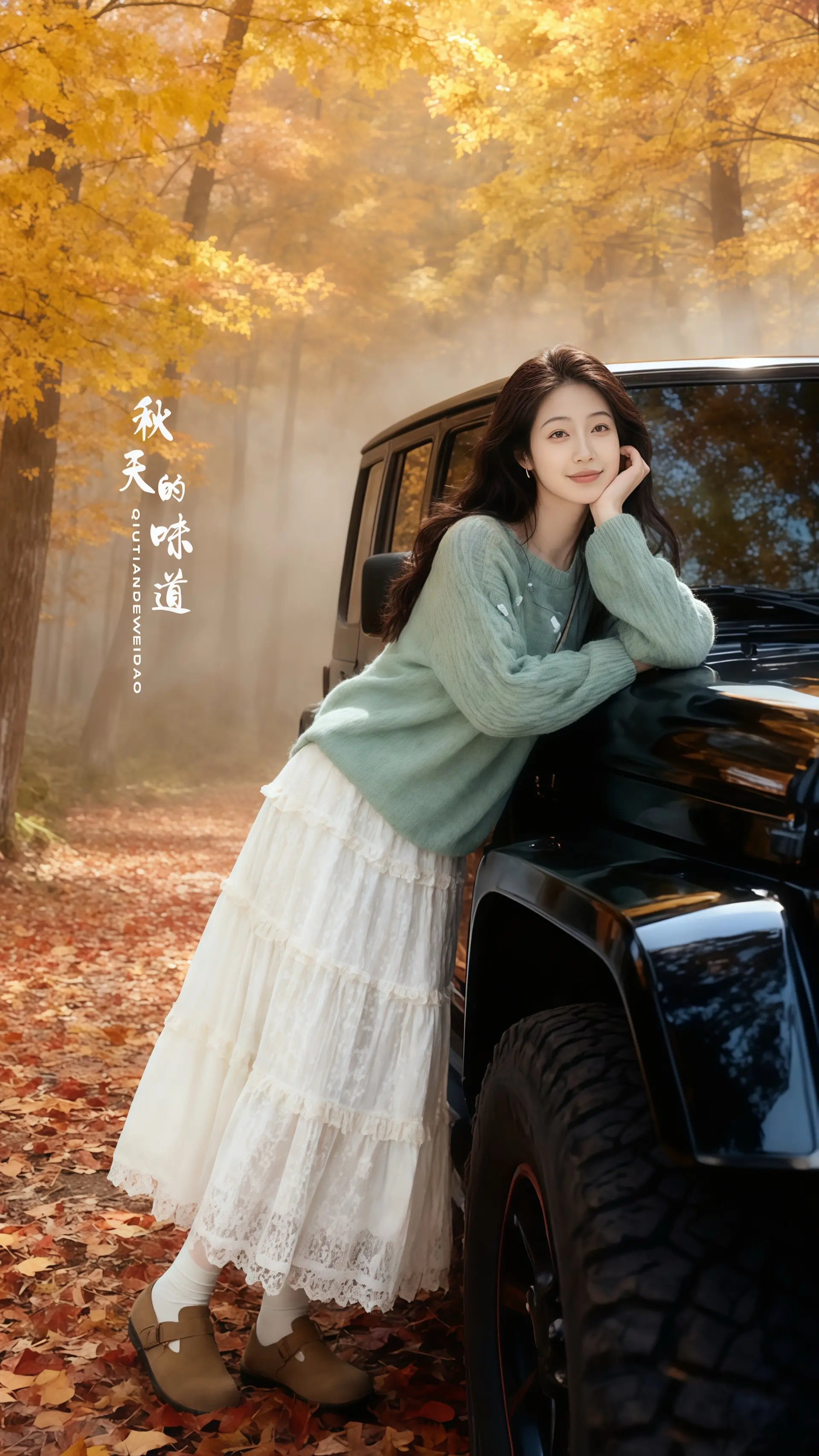 她穿着镂空针织衫两件套,浅绿色针脚勾出细碎花纹,风一吹就贴着肩颈晃,白色蕾丝半身裙下摆扫过满地枫红,像只怯生生的蝴蝶。树林里的雾还没散,金黄枫叶浸在乳白里,连阳光都变得软乎乎的。她踩着落叶往前走,每一步都有“沙沙”的轻响,直到那辆黑色越野车撞进视线——金属车身沾着晨露,在雾里泛着冷光,倒和这暖融融的秋景撞出些意思。她绕到车旁,指尖碰了碰冰凉的车门,忽然笑了。上周和朋友约好来这儿看枫,却误打误撞寻到这处秘境,连风里都裹着枫叶和针织衫上阳光的味道。