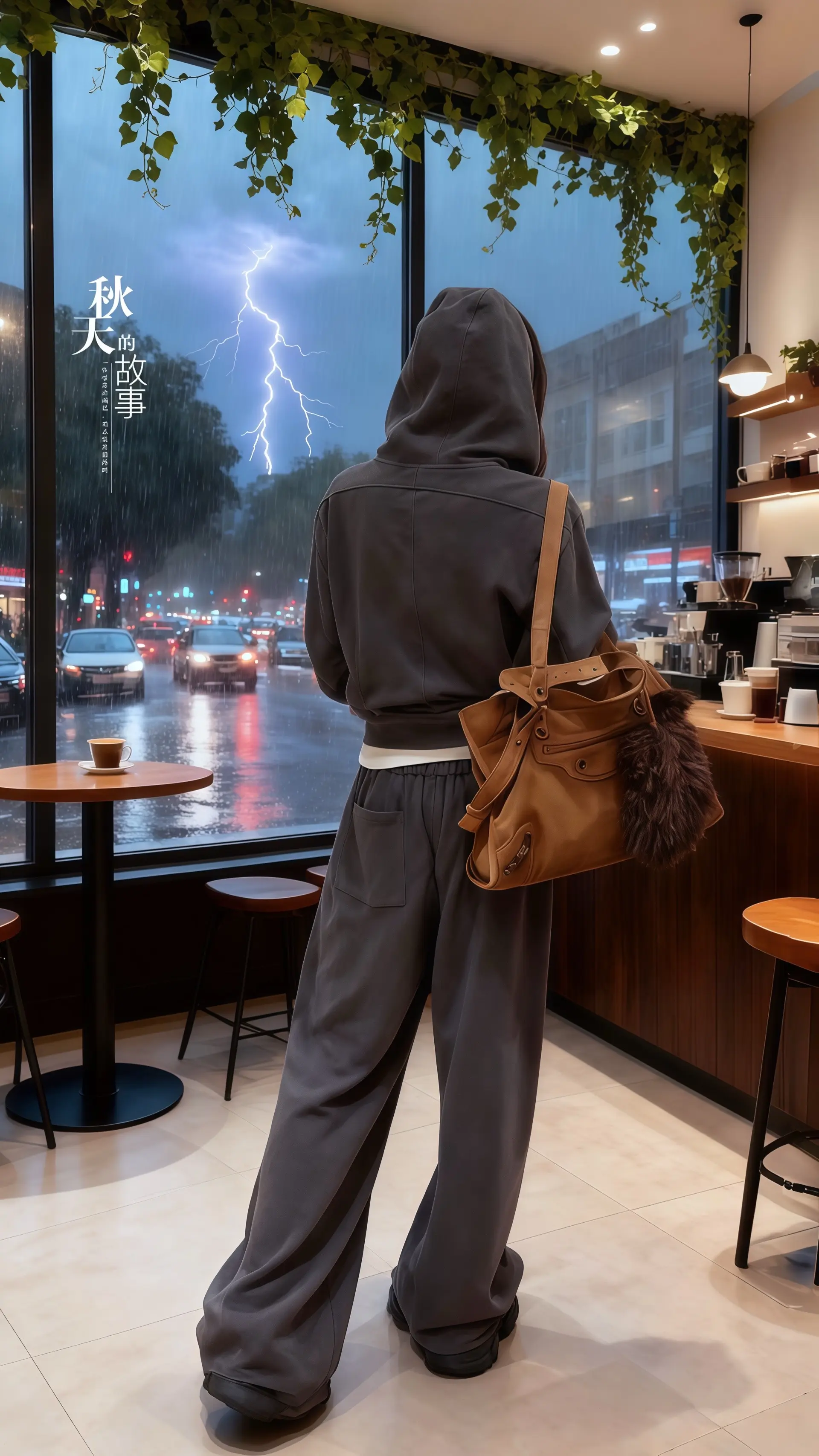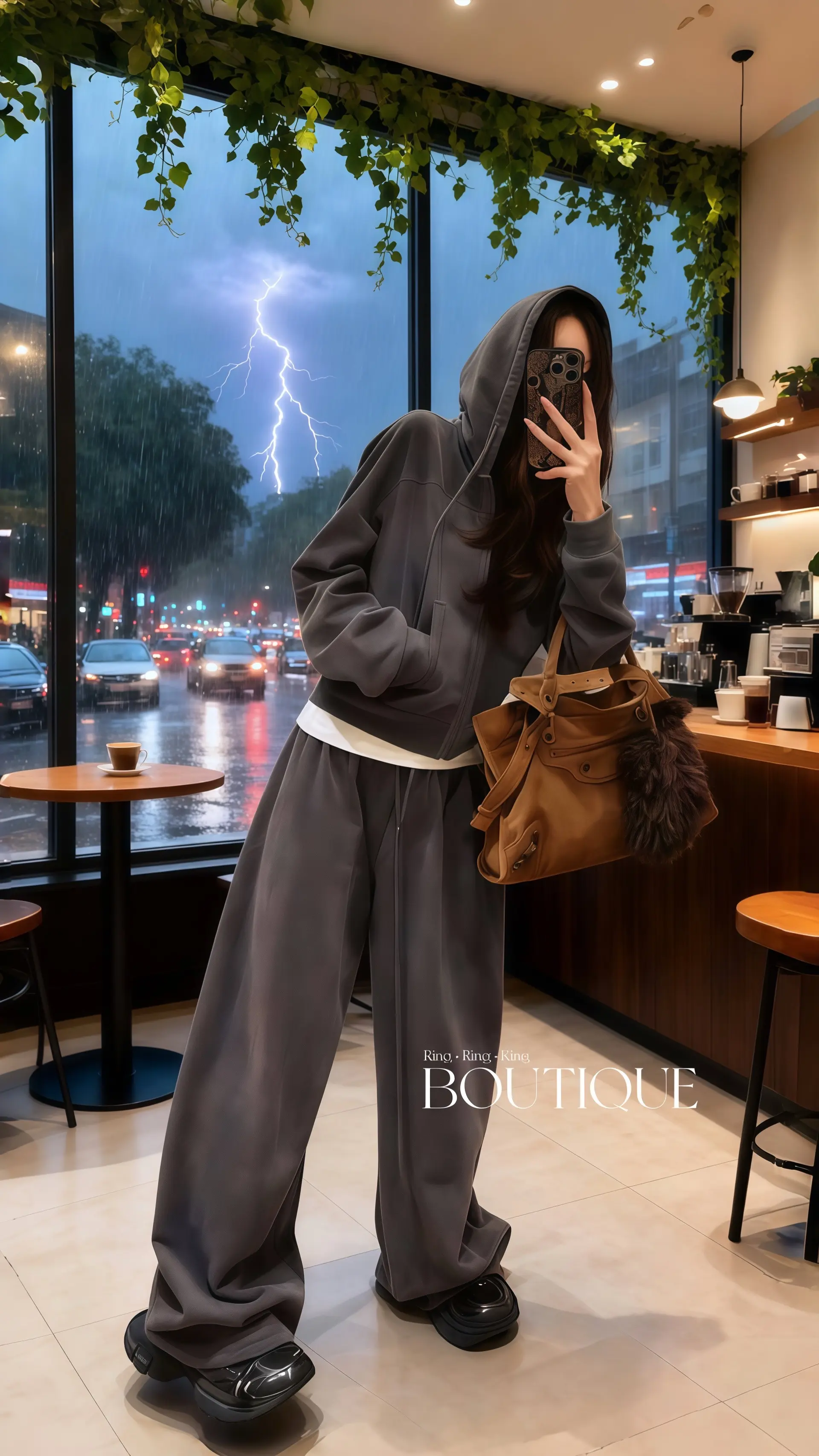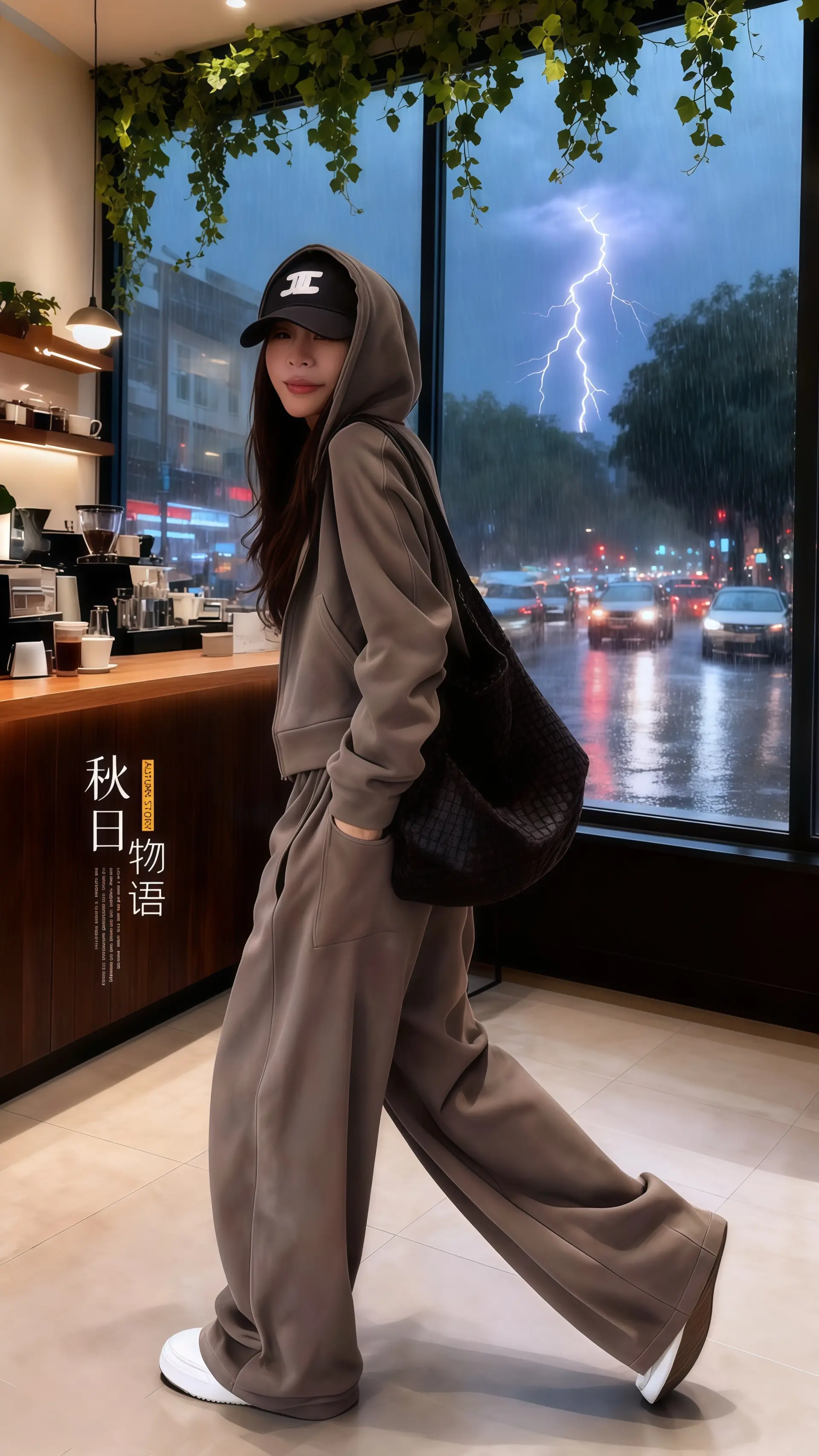 她穿着美式连帽长袖卫衣阔腿裤两件套,慵懒又随性的风格,在咖啡店暖黄的光线下格外吸睛。站在落地窗前,窗外车水马龙的街景被朦胧小雨晕染成一幅动态的油画,雨滴敲打玻璃的声响,与店内咖啡的醇香交织。她一手插兜,一手轻托咖啡杯,连帽衫的松弛感与阔腿裤的随性范,把都市的快节奏都慢炖成了这份惬意,仿佛在喧嚣里开辟出一方属于自己的舒适角落,每一处细节都在诉说着,这种不费力的时髦,才是秋日里最自在的打开方式。