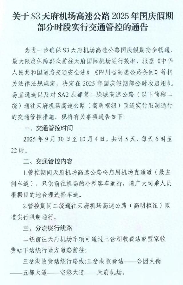 为进一步确保S3天府机场高速公路国庆假期安全畅通,最大限度保障群众前往天府国际机场通行效率,根据《中华人民共和国道路交通安全法》《四川省高速公路条例》等相关法律法规规定,决定在2025年国庆假期部分时段启用机场直通道以及对SA2成都第二绕城高速公路(以下简称二绕)通往天府机场高速公路(高明枢纽)匝道实行限制通行的交通管控措施。现将有关事项通告如下: