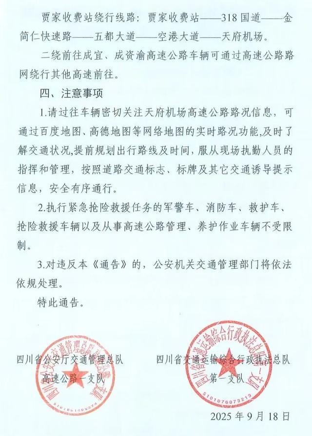 关于天府机场高速2025年国庆假期部分时段实行交通管控的通告