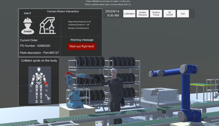在虚拟世界中,当机器人或操作员接近一定距离时,仪表板上会生成警告消息。触觉反馈被同时传送到物理世界中的实际区域。操作员可以在与机器人交互时检测到异常情况。