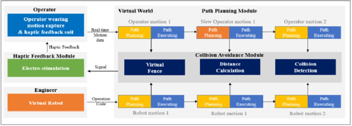 提议的框架包括几个模块。操作员穿着全身触觉服,通过无线网络连接到虚拟人。操作员的动作反映在虚拟世界中,与机器人的碰撞检测基于定义的装配序列进行测试。在机器人关节和末端执行器中安装了一个虚拟围栏,以防止协作过程中发生事故。