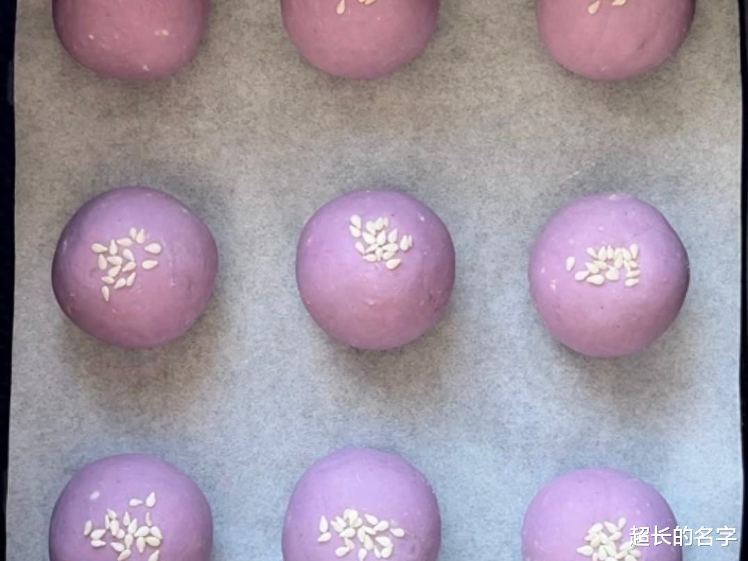 6. 烤箱提前180℃预热10分钟,把包好的芋泥麻薯球放在铺了油纸的烤盘上,表面刷一层薄薄的牛奶,再撒点熟黄豆粉。