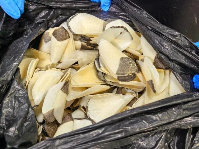 近日,广州海关所属广州邮局海关关员在对进境邮件进行监管时,发现一件进境邮件机检图像异常。经查验,现场关员发现邮件内为一个黑色塑料袋,塑料袋中装有大量的鳞片状物品,每个鳞片有约三分之二面积呈乳白色,约三分之一面积呈黑色。经送技术机构鉴定,确认上述鳞片为巨巴西骨舌鱼的鳞片,共计500余片、重2031克。