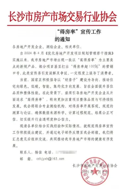值得注意的是,在项目“热销”的同时,行业对“得房率”宣传的规范也在加强。9月8日,长沙市房地产交易行业协会发布《关于征集规范“得房率”宣传工作的通知》,将着手规范“得房率”的相关宣传用语。