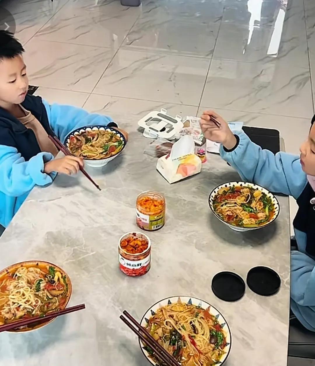 今天中午,勤快的郭威亲自给一家四口做了一份热腾腾的肉丝面! 看起来色香味俱全,蛮有食欲, 两个孩子都穿着校服, 应该是中午都接回家吃饭, 北方的饭非常的简单, 中午一人一碗面条,再加上萝卜干, 田静趁机会发个小广告, 推荐网友买萝卜干吃, 真是两全其美,其乐融融! 郭威作为一个父亲和老公,看起来还是蛮称职的!