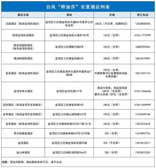 目前,金湾区已经协调区内部分酒店,按照台风期间的优惠价格服务市民群众。