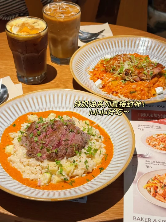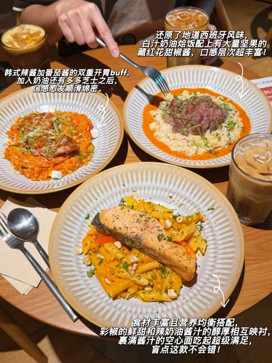 新出的「辣味奶油系列」和“轻盈小金杯”饮品, 我都替大家尝过啦,必须来分享一波, 不管是爱吃辣奶油的还是爱喝咖啡的宝子,这期新品一定得试试~ ✅先来说说「辣味奶油系列」的美食,三款都很有特色 【藏红花牛菲力甜椒烩饭】 这款还原了地道西班牙风味。白汁奶油烩饭配上有大量坚果的藏红花甜椒酱,藏红花真的很香,一口下去层次超丰富的,5分熟的牛菲力口感真的绝了,淋上搭配的雪莉酒醋瞬间腻感清零! 【香煎三文鱼辣味奶油空心面】 三文鱼+南瓜+彩椒+腰果+空心面,食材丰富且营养均衡搭配。南瓜与甜椒和辣奶油酱一同翻炒,彩椒的鲜甜和辣奶油酱汁的醇厚相互映衬,裹满酱汁的空心面吃起超级满足,盲点这款不会错! 【香烤鸡肉辣味芝士烩饭】 韩式辣酱加番茄酱的双重开胃buff,加入奶油后,口感愈发顺滑绵密。更绝的是,还用到了摩拉维亚干酪与发达芝士两种芝士,那浓郁醇厚的奶香味吃起来真的特别上瘾! ✅“轻盈小金杯”饮品,也算是我近期很值得一试。 【一整颗橙C美式】 用了一整只橙子鲜榨果汁的真橙C美式,还能喝到淡淡的桂花香,好喝喜欢。 【海盐轻芝芝拿铁】 轻芝士牛乳是普通芝士酪乳热量含量和脂肪含量的1/3,又保留了芝士醇厚口感,加了真海盐制作的咸味拿铁,咸香交织。 【玉米轻芝芝拿铁】 轻芝士牛乳+鲜制的玉米汁,这杯的真好特别,有点像在吃前段时间超火的芝士蛋挞的感觉! 这次新品不管是食物还是饮品,都很有亮点,大家准备好可以冲啦~