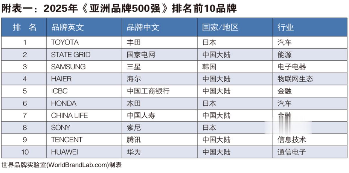 此次入选的亚洲500强品牌中,丰田、国家电网、三星名列前三,占据榜单前十的还有海尔、中国工商银行、本田、中国人寿、索尼、腾讯和华为。
