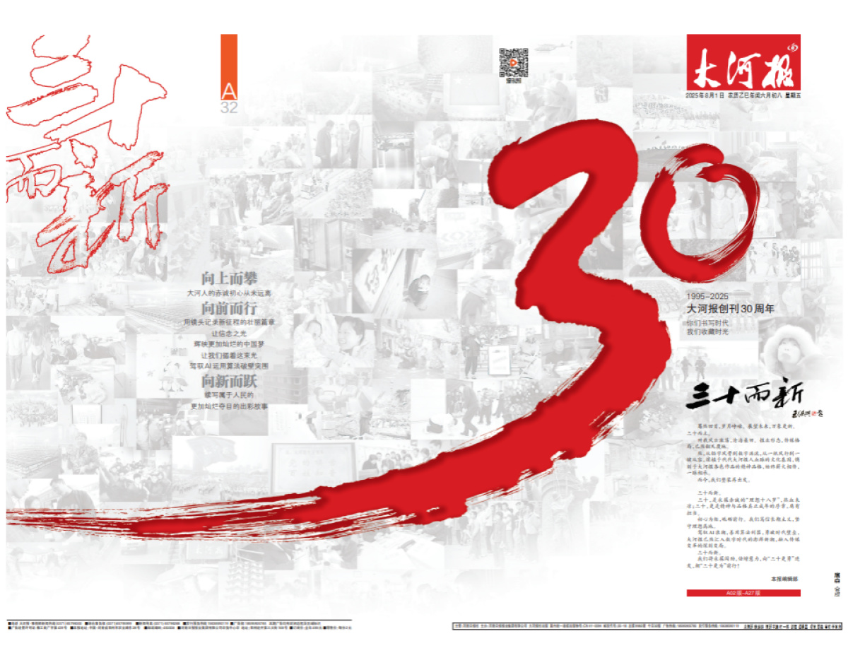 8月1日,大河报迎来创刊30周年,在一场主题为“三十而新”的庆典活动中,通过重磅纪念特刊、经典影像展、16城户外大屏联动点亮、跨代报人“同框”等多元形式,串联起三十载峥嵘岁月与未来期许,展现了一份地方媒体与城市、时代同频共振的深厚情谊。