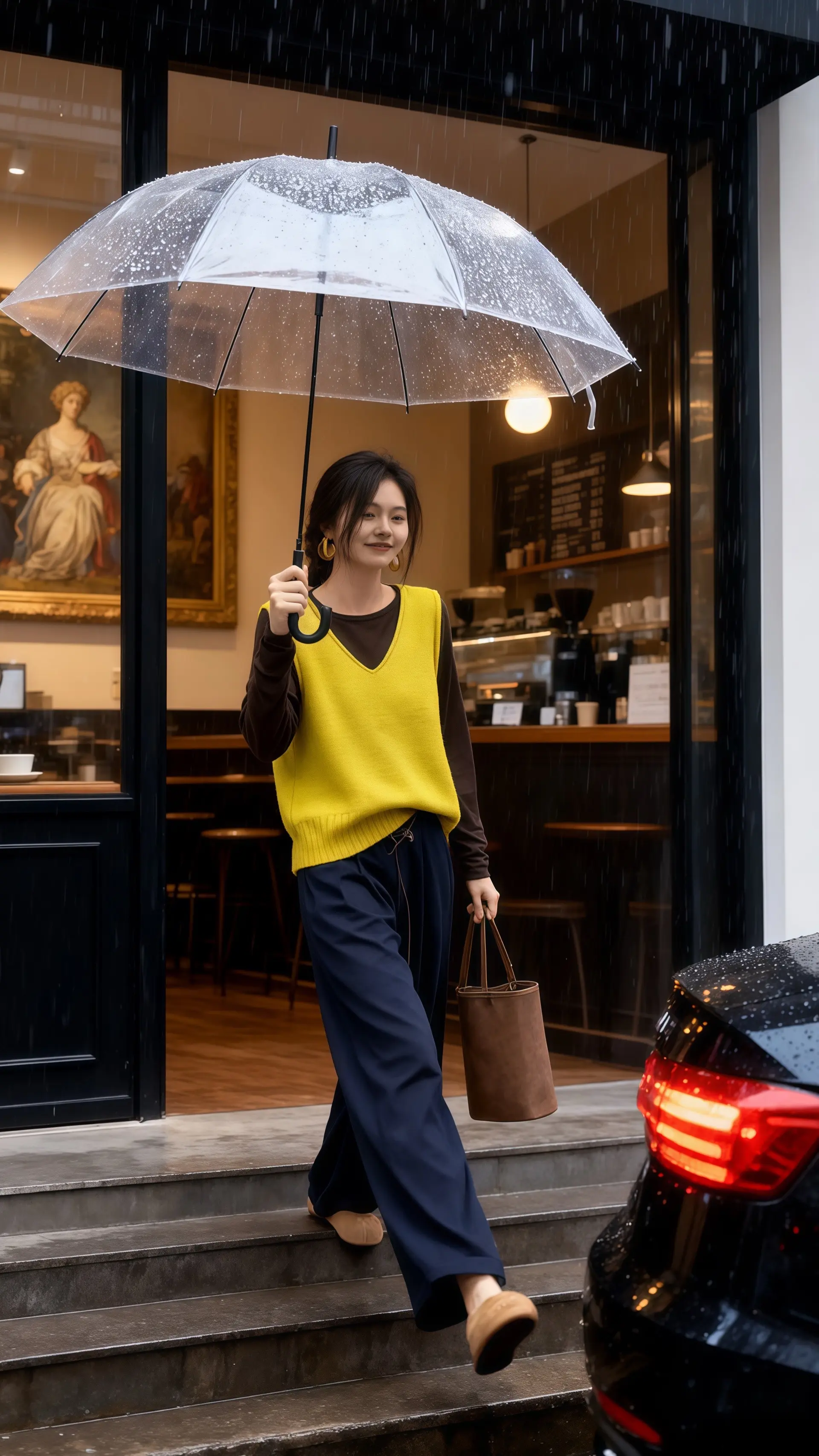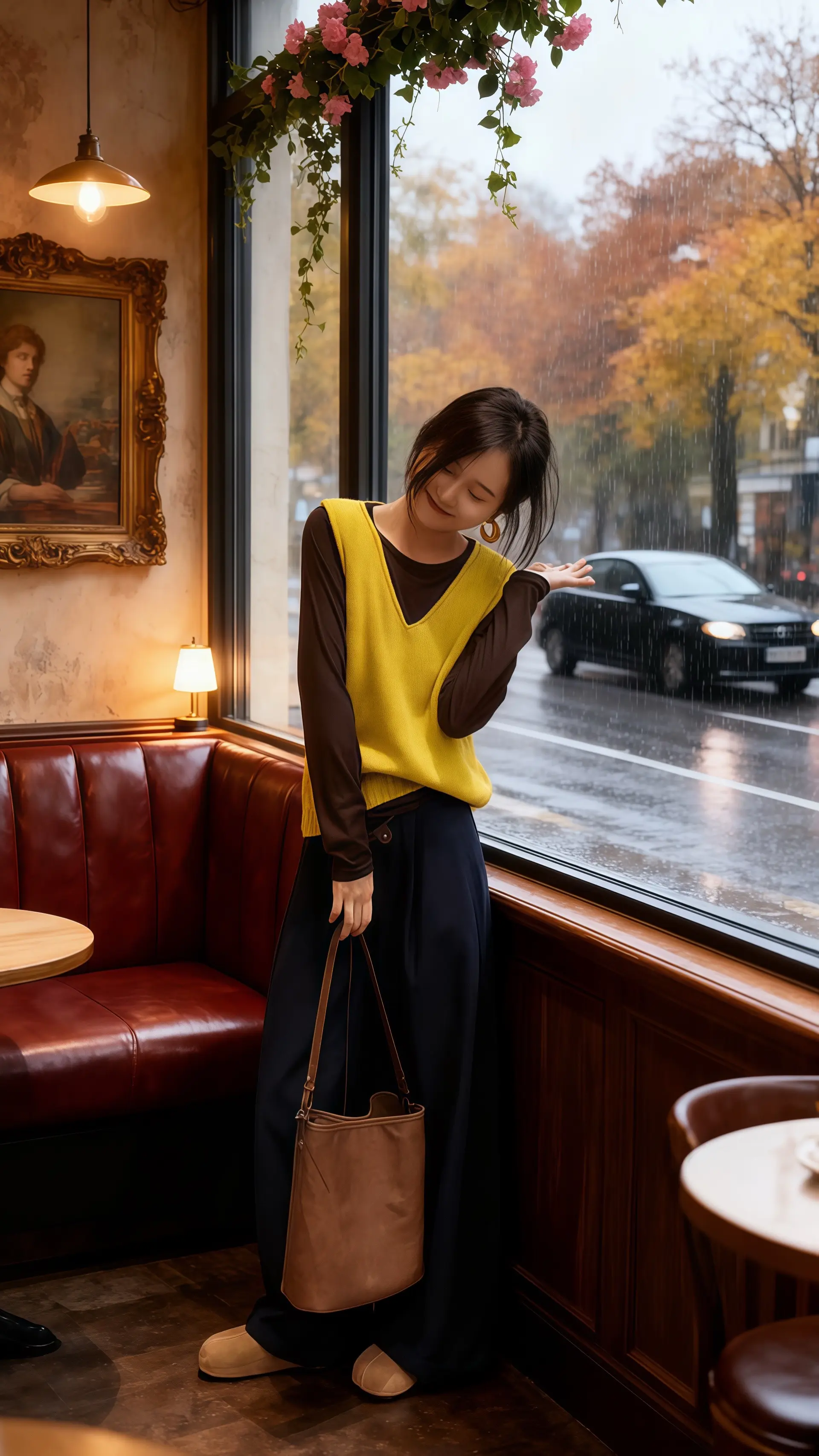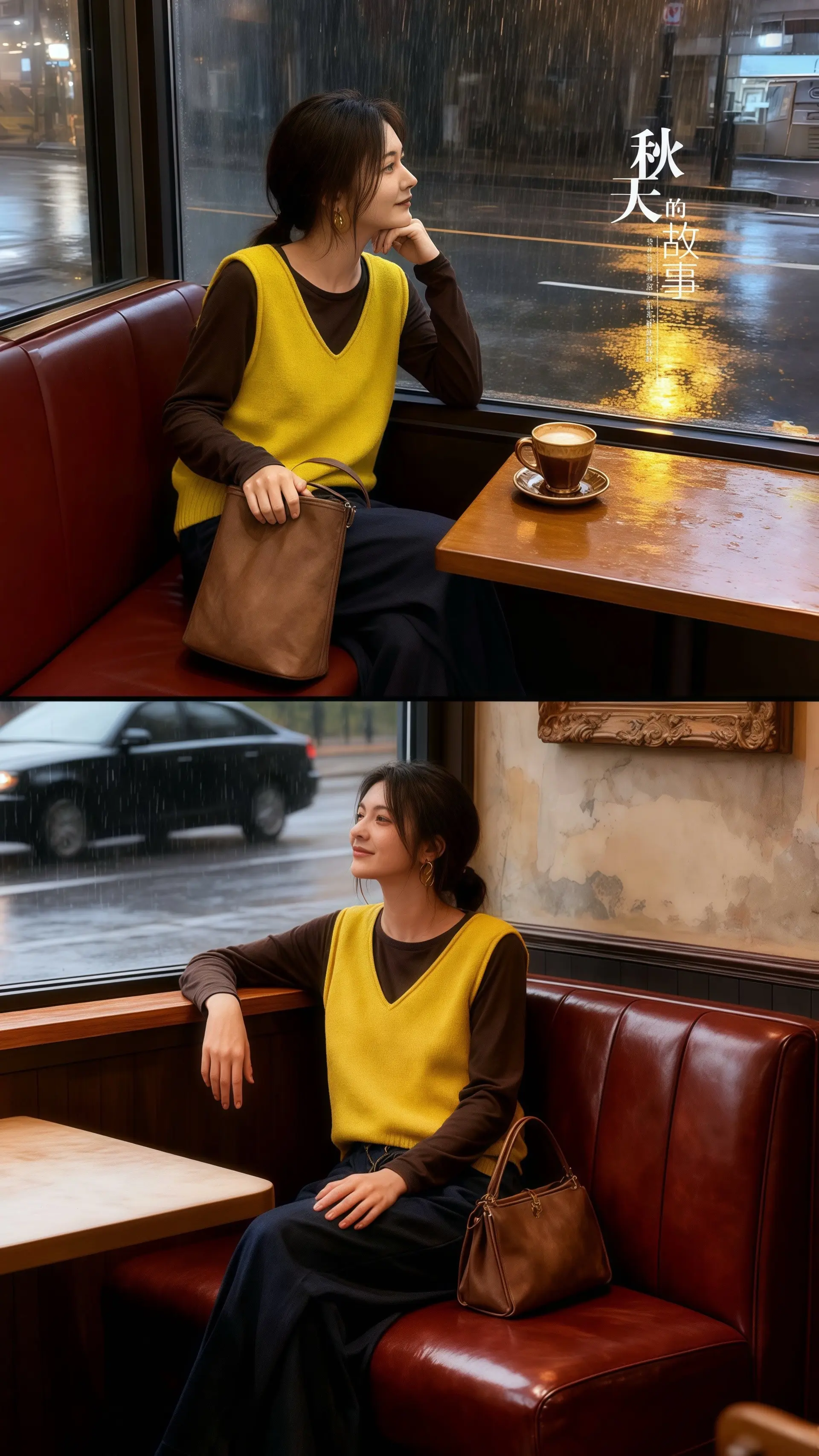她穿着黄色针织背心三件套,在复古咖啡店的落地窗旁自成风景。暖黄针织与深棕内搭、藏蓝阔腿裤碰撞出雅致格调,棕色托特包随姿态轻晃,将秋日氛围感拉满。落地窗外,朦胧小雨晕染街景,黑色汽车驶过溅起细碎水花,店内暖光小吊灯与墙上欧式名画相映,棕红色真皮卡座更衬得这份穿搭高级又松弛。她或倚窗浅笑,或静坐品咖,每一个姿态都似电影帧,把咖啡香、雨丝凉与穿搭的质感,揉成了独属于秋日的浪漫叙事。