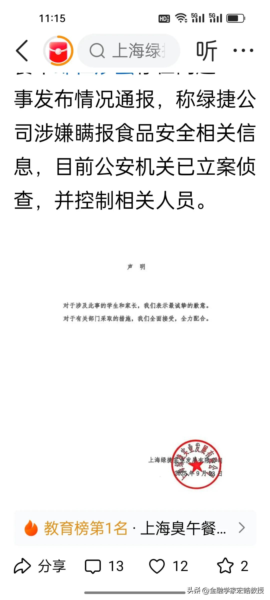 这大概是最短的道歉信了吧?全文43个字,包括标点符号47个字,西贝的整改措施和道歉可比这诚恳的多,毕竟西贝面对的是未知的消费者,绿捷面对的是每天50万份供餐的确定学生。昨天看到上海通报中,相关负责人已经被警方控制,可是没提到从现在开始替代绿捷的供餐公司是哪家呢?有网友说,自己孩子目前的供餐公司仍旧是绿捷,昨天上海的通报中讲了,每学期会根据家长满意度调查调整供餐单位,现在要找到能供餐日均50万份的企业还是比较难吧?