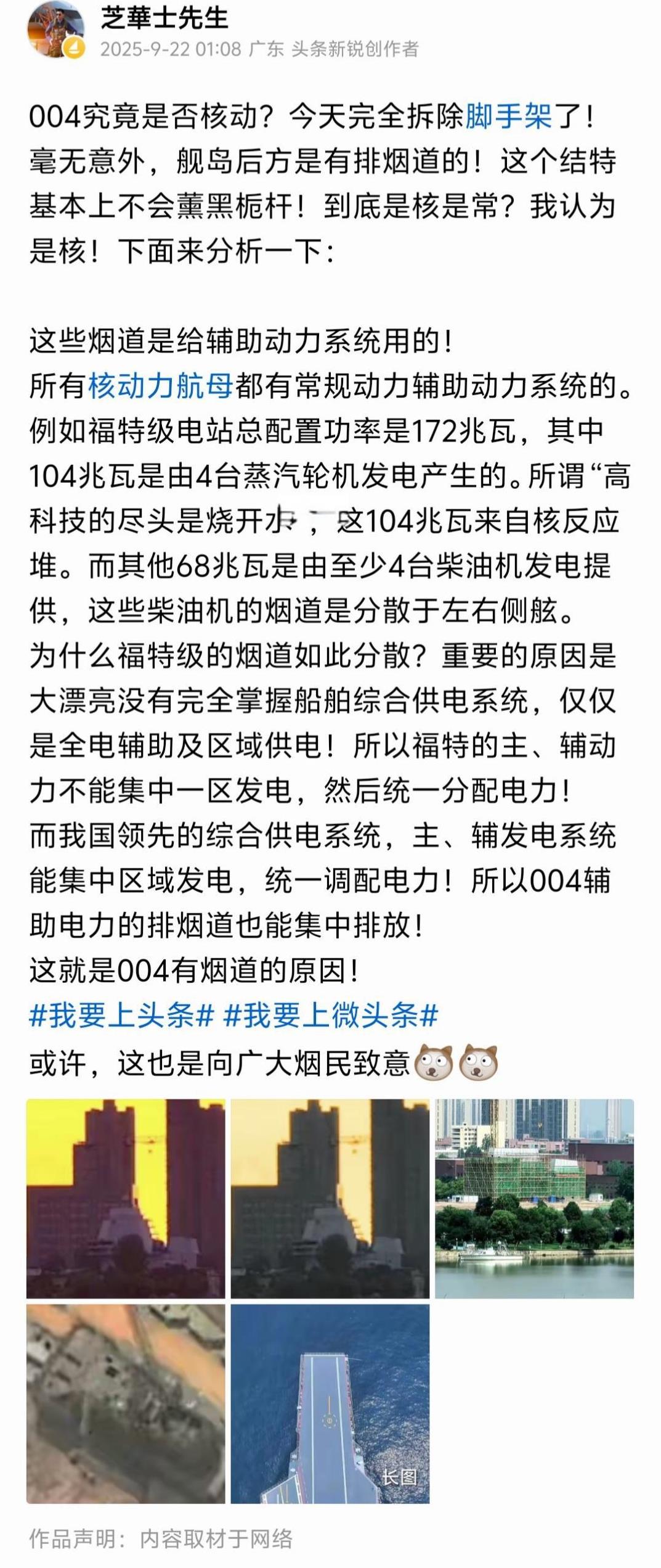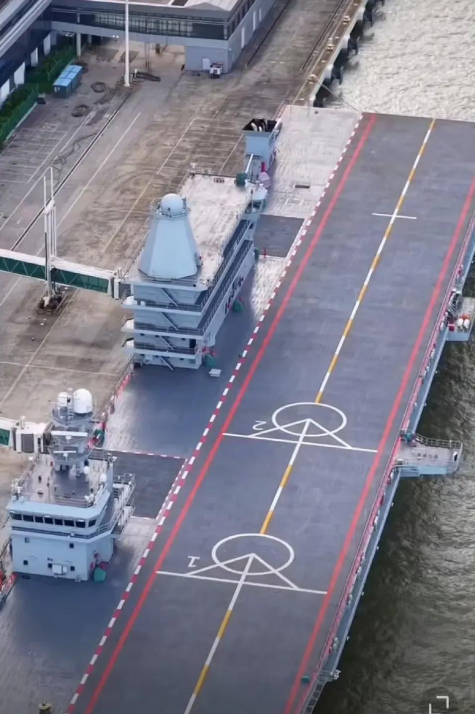 水泥航母楼清楚了,二元结构,前面是舰岛;后面低矮的是排烟道!类似结构在“民用航母”中船探索一号上见过,甲板后端那座小舰岛就是排烟道(图③④)! 这个设计新颖、巧妙!解决了辅助动力系统的集中放置与排放问题。这是核动力航母无疑,我们在22日已讲述过原因(图⑤)。 不要认为一定要与福特号一样,这个设计就比福特先进!福特号连F35也弹射不了,弹射系统280次就要趴窝[捂脸]
