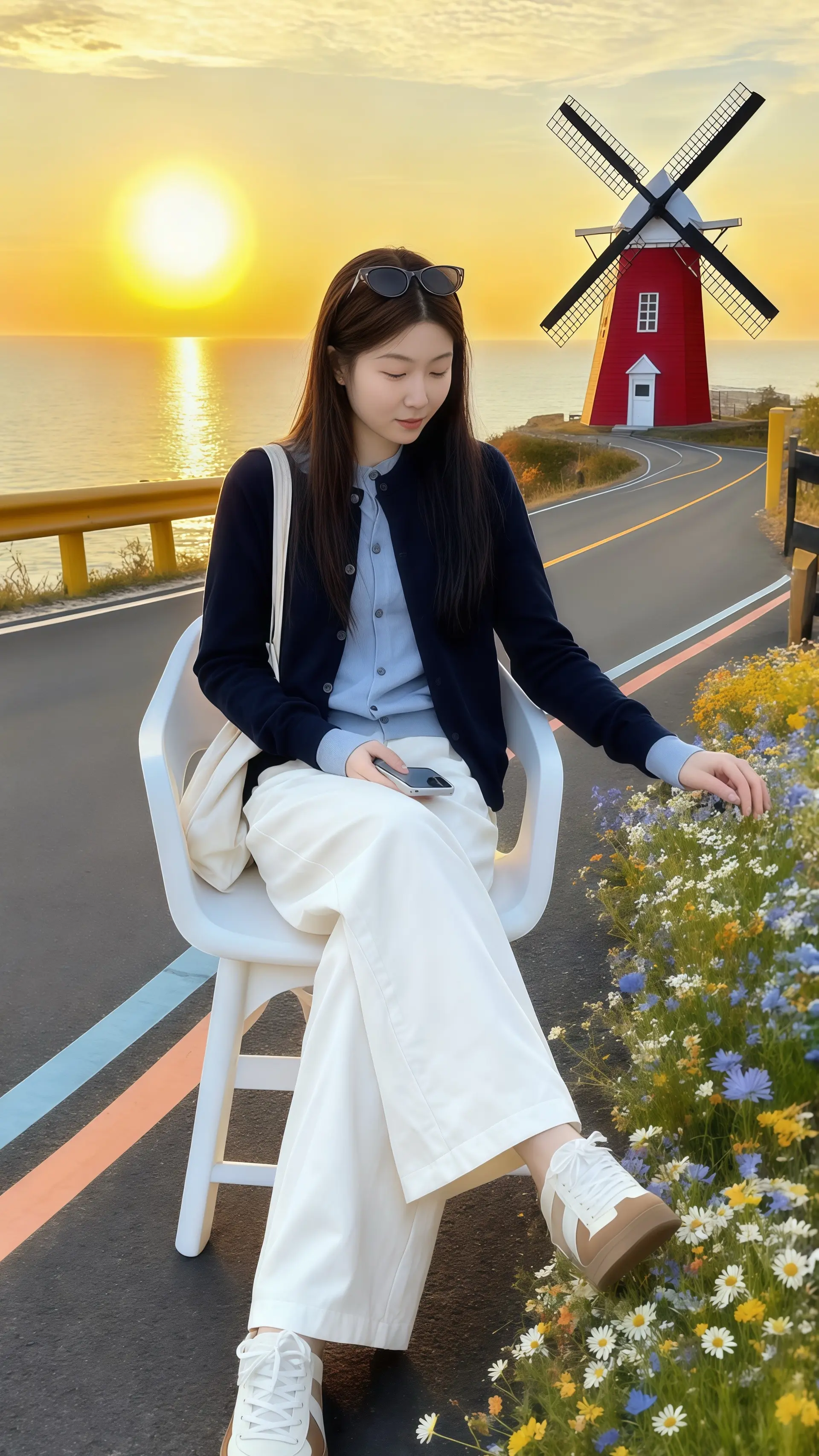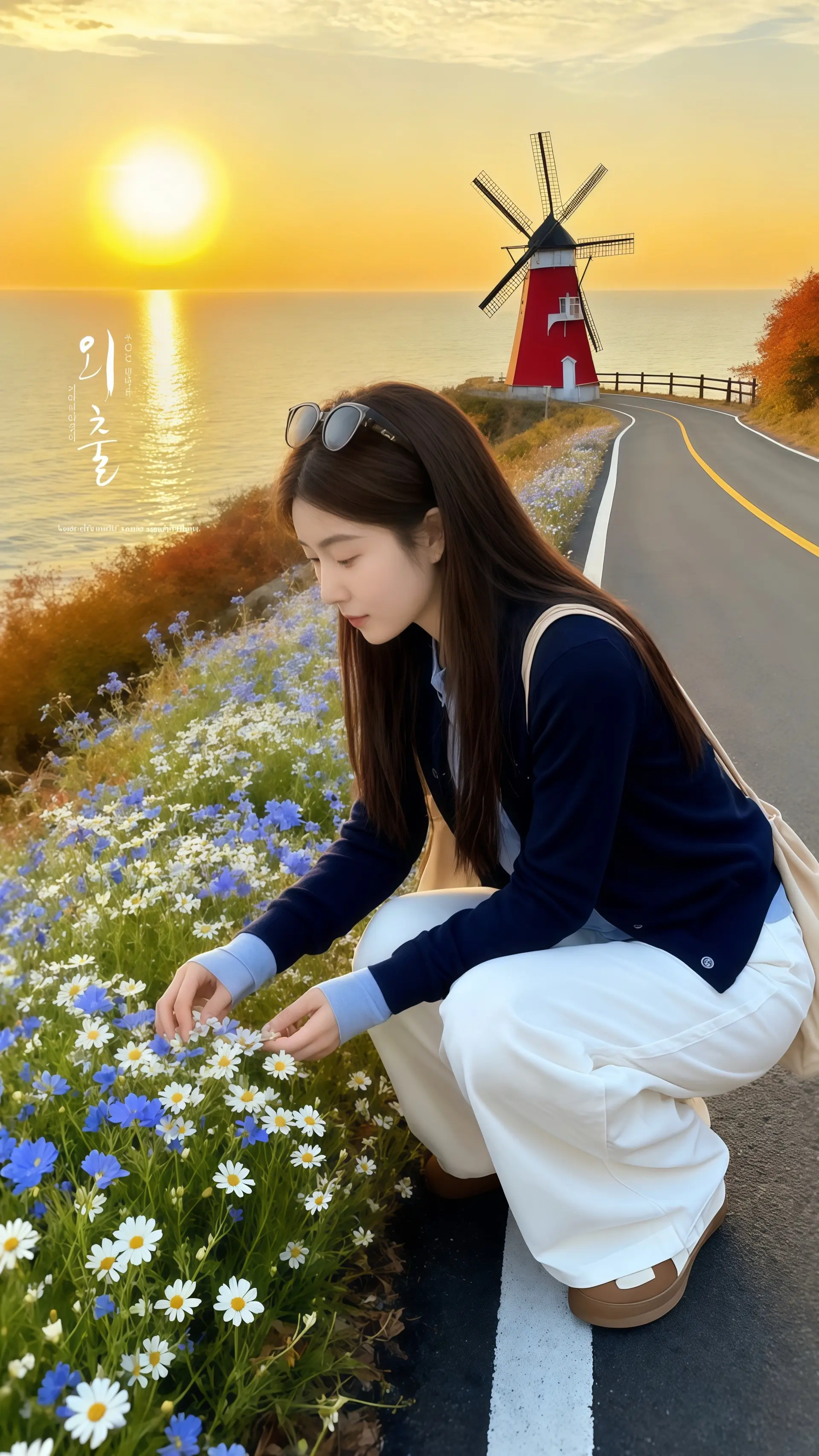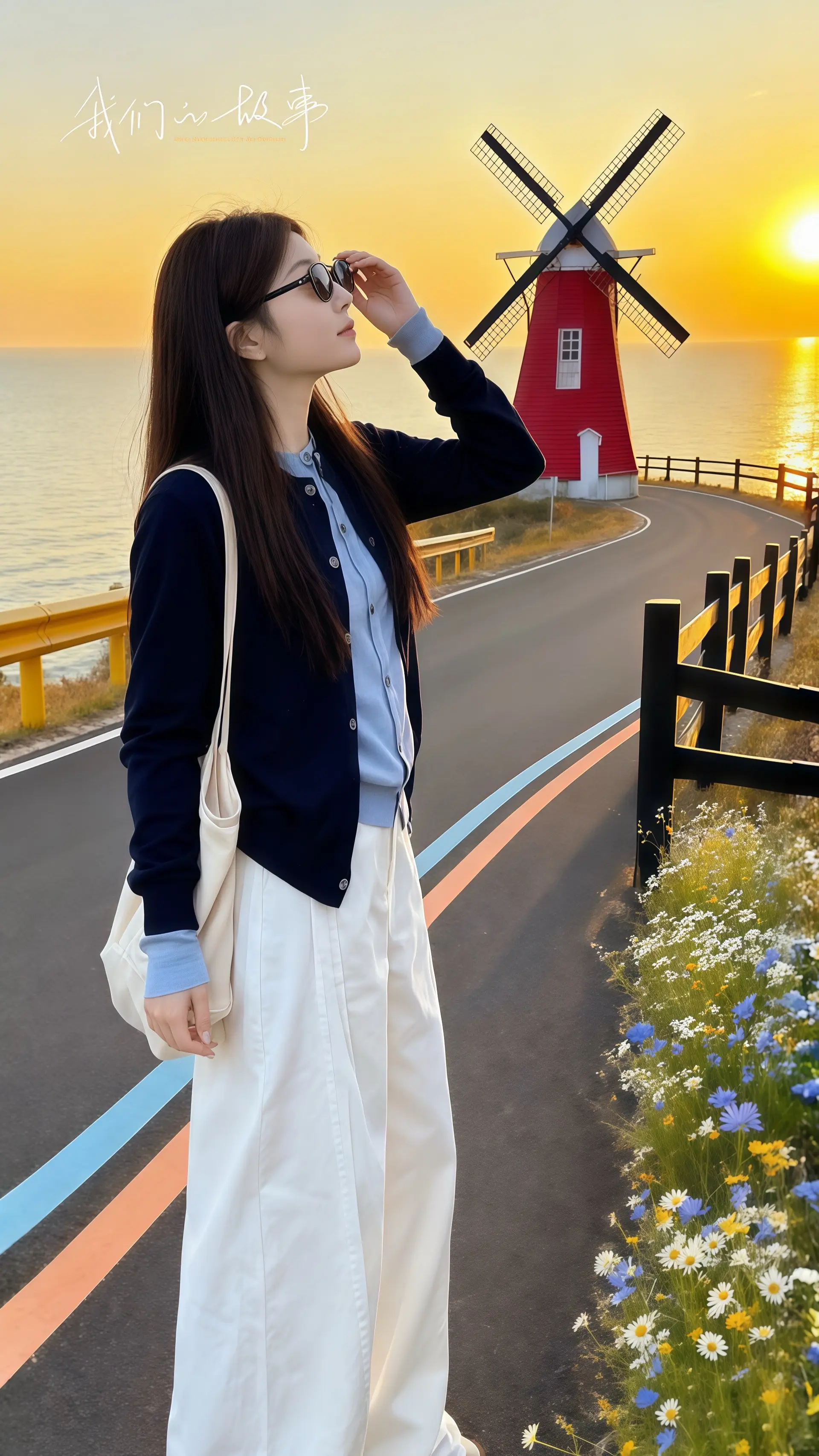 晚风与针织的邂逅 她穿着高级感针织衫白色阔腿裤两件套,浅蓝针织衫温柔地贴合身形,白色阔腿裤在晚风里漾起慵懒的弧度,每一步都似踩在秋日的诗行上。红色风车在夕阳下旋转,把金橙色的光切成细碎的光斑,落在她针织衫的纹理里。海风吹动裤脚,她站在沿海公路旁,身后是落日熔金的天际,身前是野花点缀的草地。当最后一缕余晖掠过她的发梢,针织衫的质感在暮色里愈发温润,白色阔腿裤与晚风共舞,和那抹热烈的红风车、温柔的夕阳一起,把这帧画面酿成了一首关于秋日浪漫的电影诗。