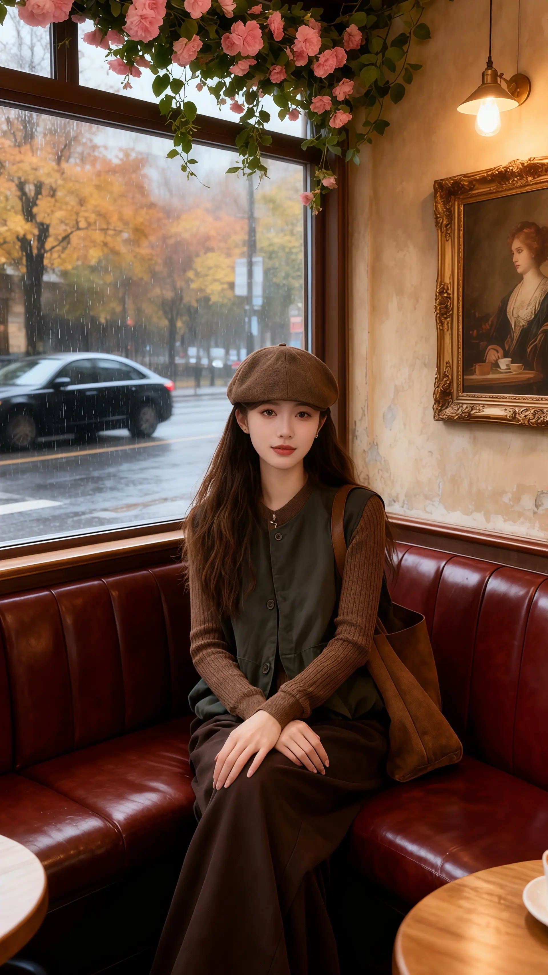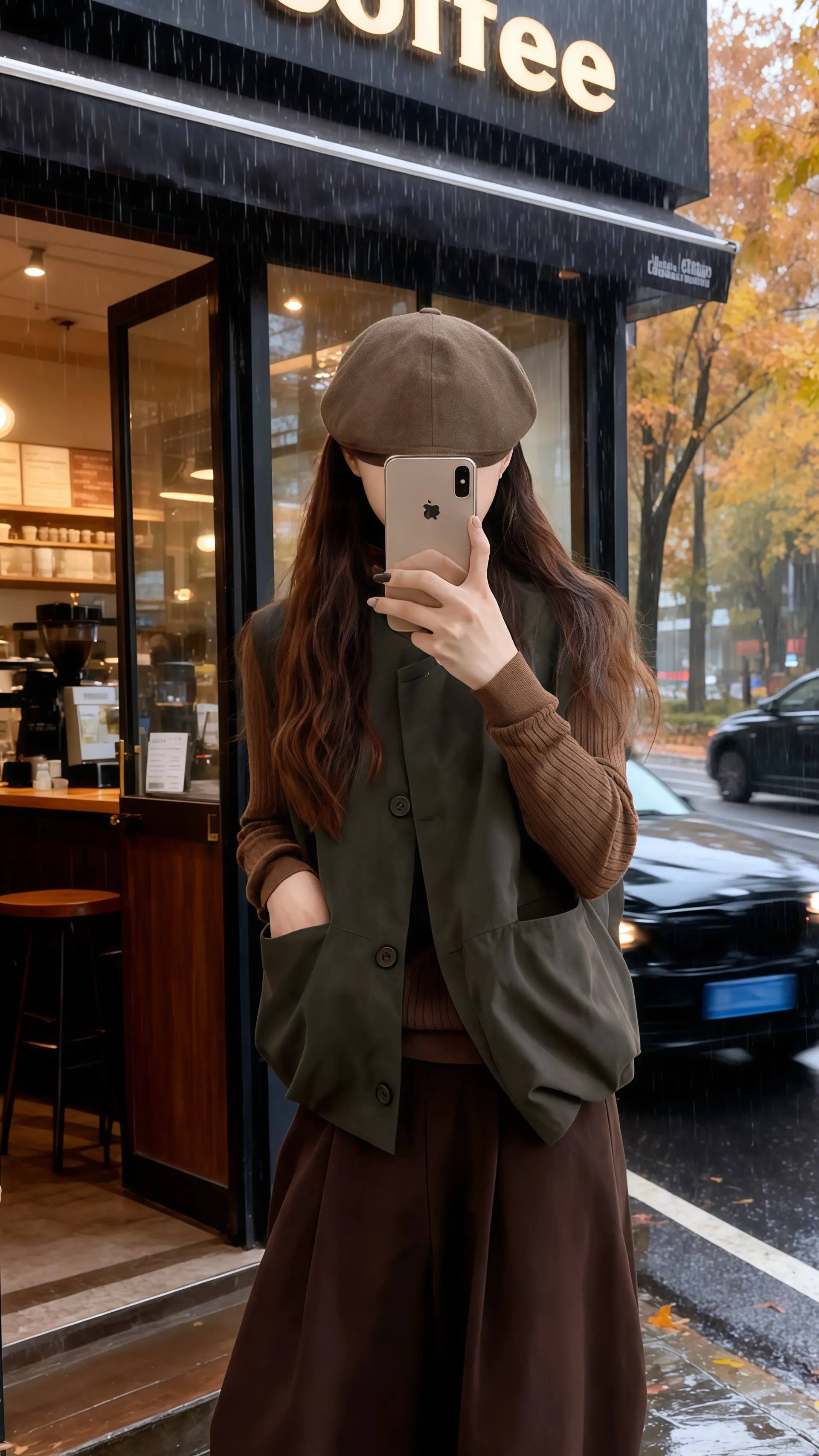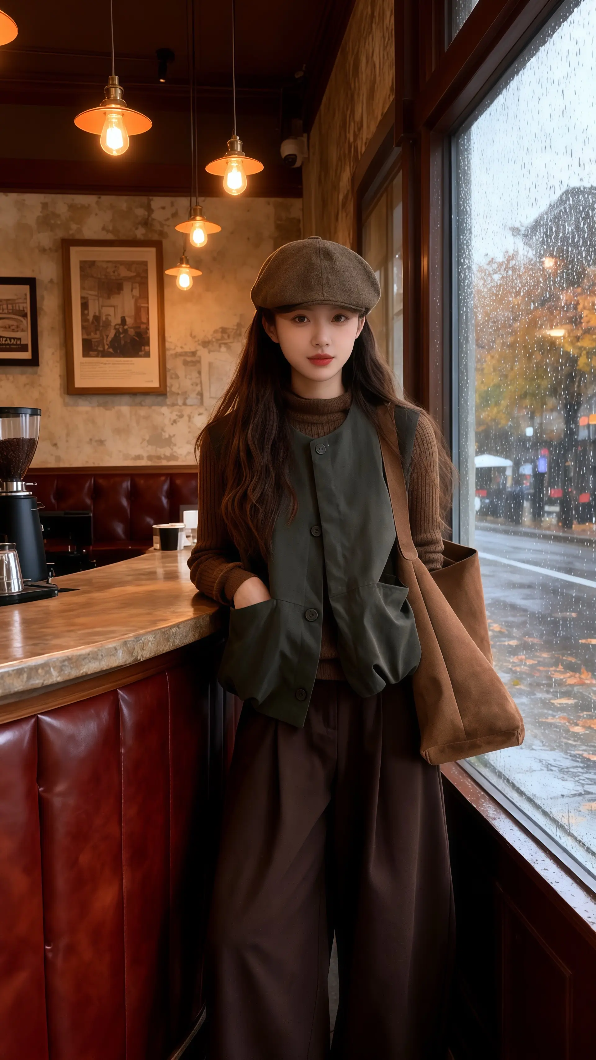 她穿着复古无袖马甲针织三件套,在咖啡店内的暖光里自成一帧复古电影画面。橄榄绿马甲的随性廓形,叠着棕褐针织衫的温柔纹理,再坠上深棕阔腿裤的慵懒腔调,搭配报童帽与麂皮大包,每一处细节都藏着旧时光的韵味。窗外细雨朦胧,将街景晕染成莫兰迪色调,店内的复古石灰墙、暖棕卡座与欧式挂画相映成趣,她指尖划过咖啡杯沿,光阴仿佛在此刻慢炖,把日常穿搭酿成了一首关于复古与松弛的诗,每一寸都透着不刻意的精致,在烟雨与咖啡香的交织里,活出了独属自己的风格篇章。