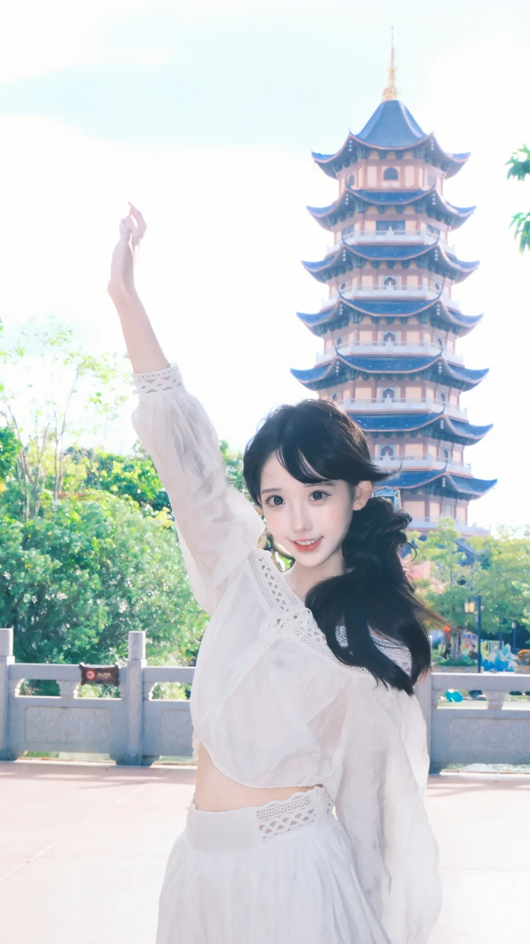 神州塔:人物站两侧不遮挡塔体,拍中景突出塔的宏伟