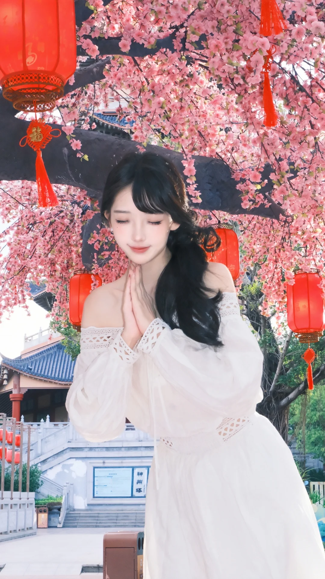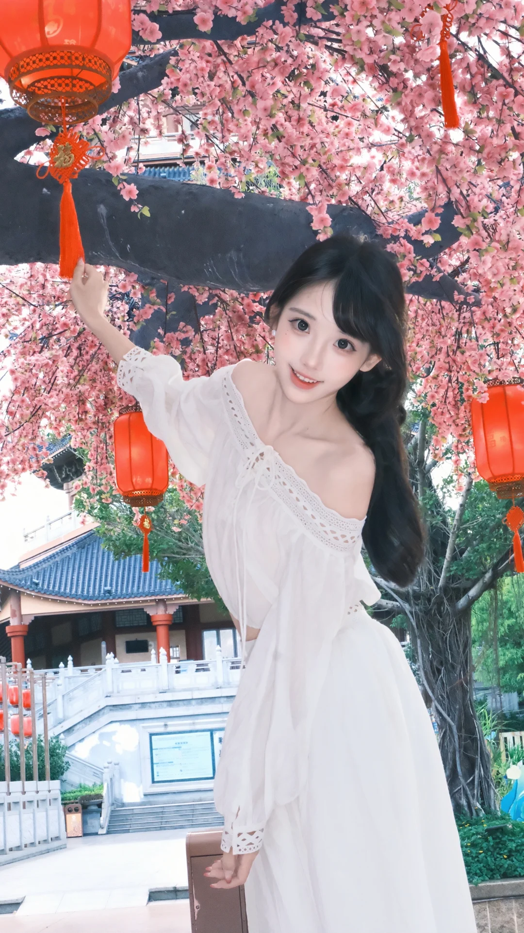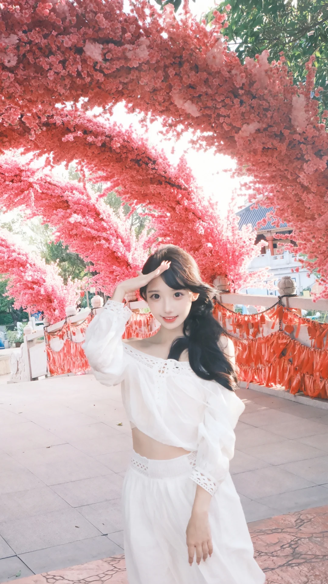十里桃林(神州塔前):全景拍全身,突出桃林浪漫感